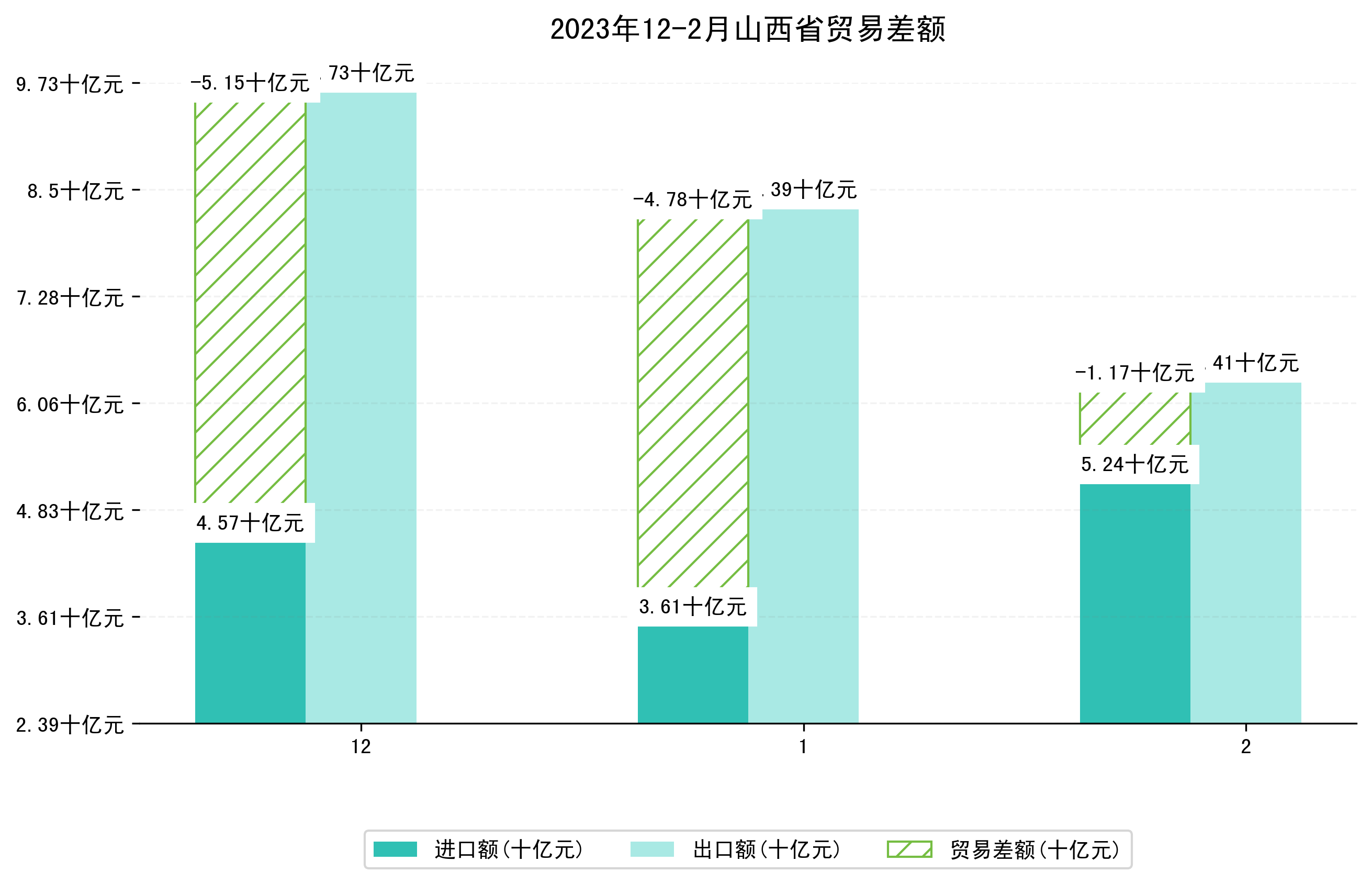 以人民币计,2023年1-2月山西省贸易差额为59,4655,1072万元(贸易顺差),相比上年同期减少了6,2824,7091万元,同比减少-9.56%。