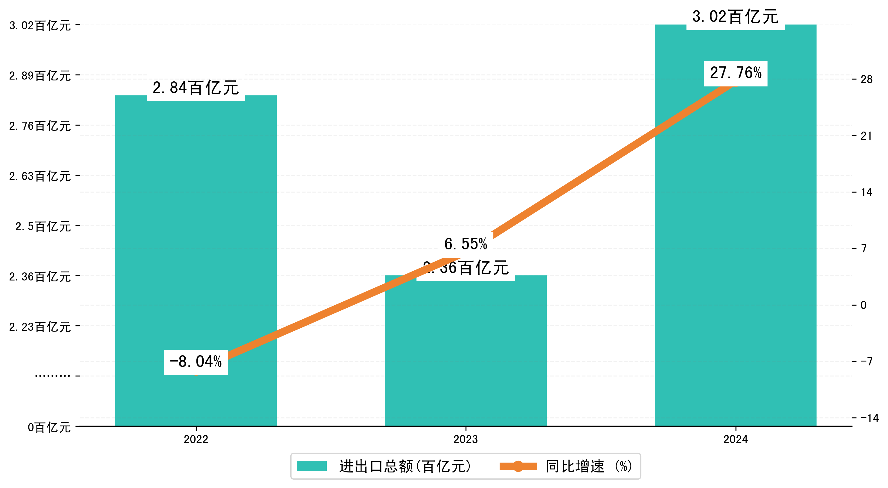 以美元计,2024年1-2月山西省进出口总额为42,5010.3653万美元,相比上年同期增加了8,1436.9588万美元,同比增加22.80%。