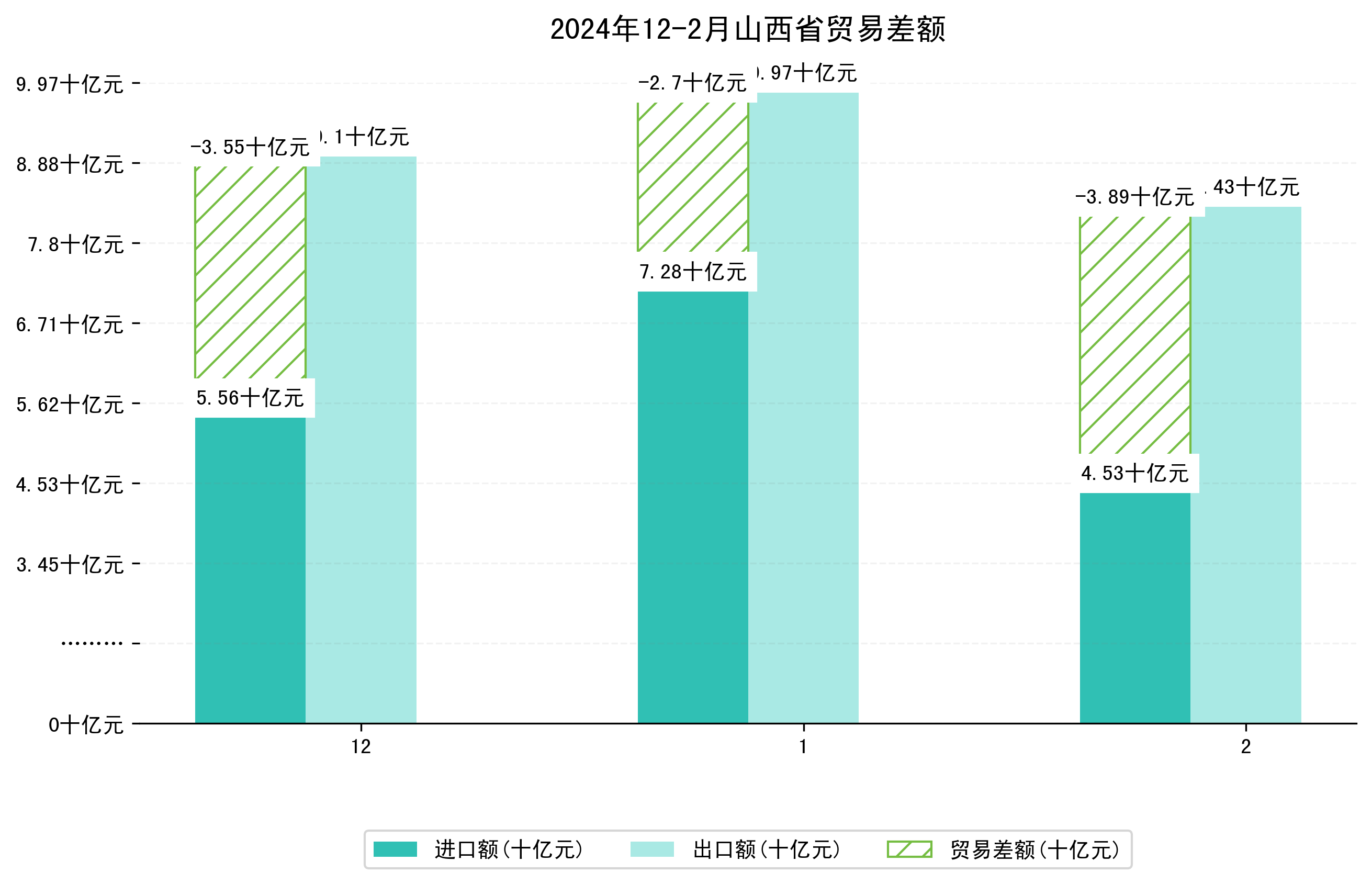 以人民币计,2024年1-2月山西省贸易差额为65,8935,3785万元(贸易顺差),相比上年同期增加了6,4280,2713万元,同比增加10.81%。