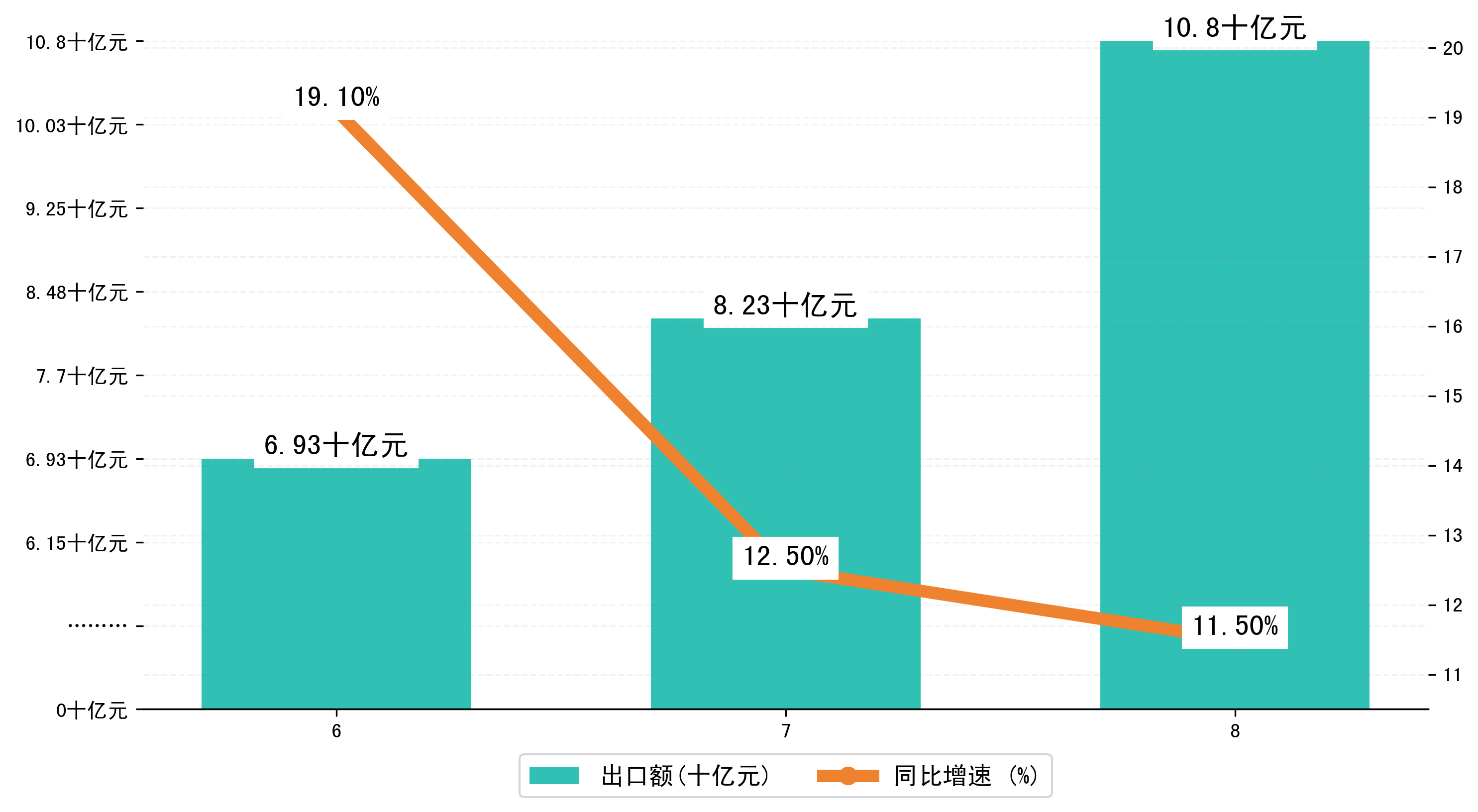 以人民币计,2024年8月山西省出口额为108,0231.7267万元,相比上月增加了25,7542.6324万元;相比上年同期增加了6,4782.4443万元,同比增加了11.50%。