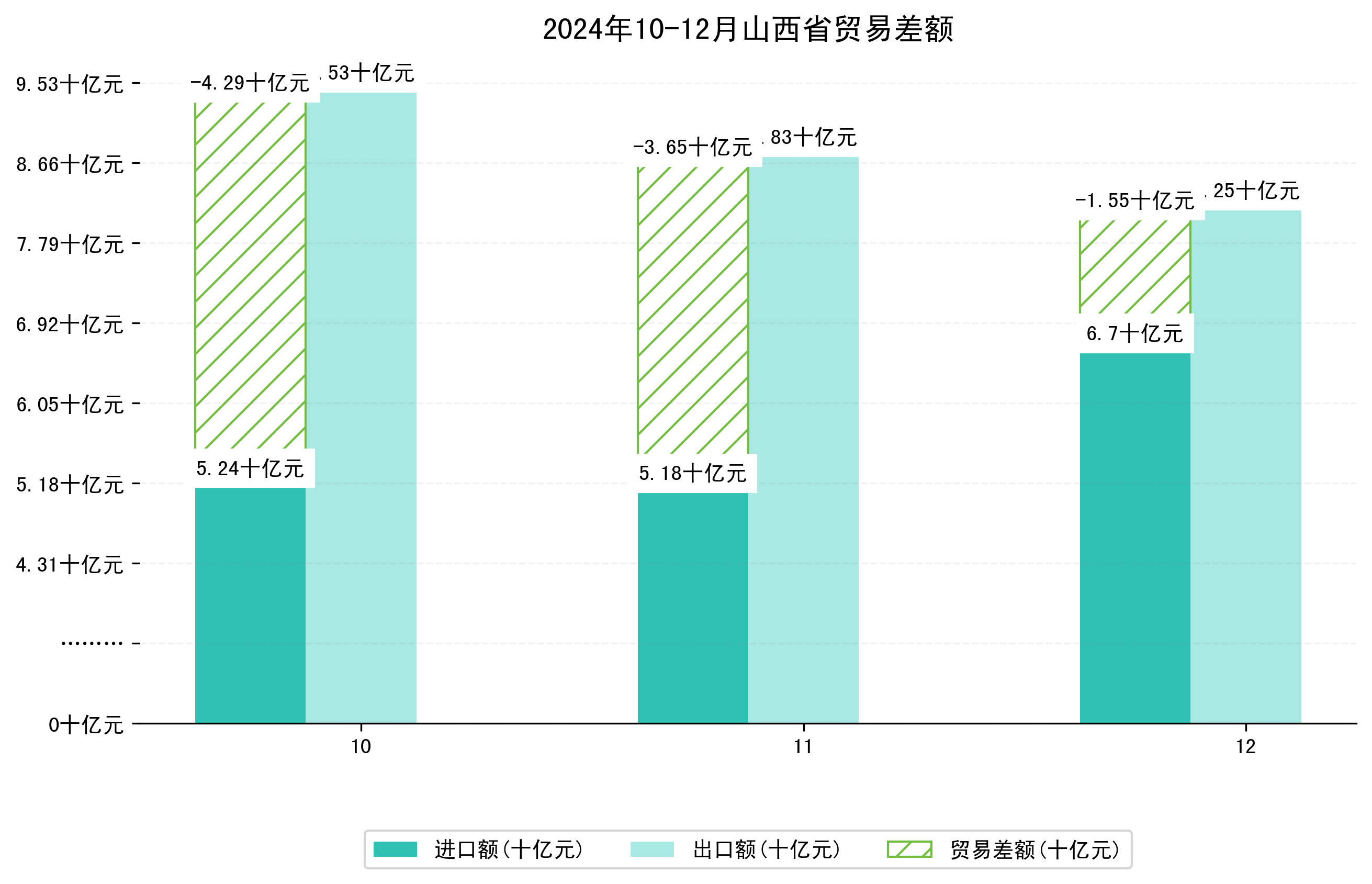以美元计,2024年1-12月山西省贸易差额为54,4953,2289万美元(贸易顺差),相比上年同期减少了3,1487,0304万美元,同比减少-5.46%。