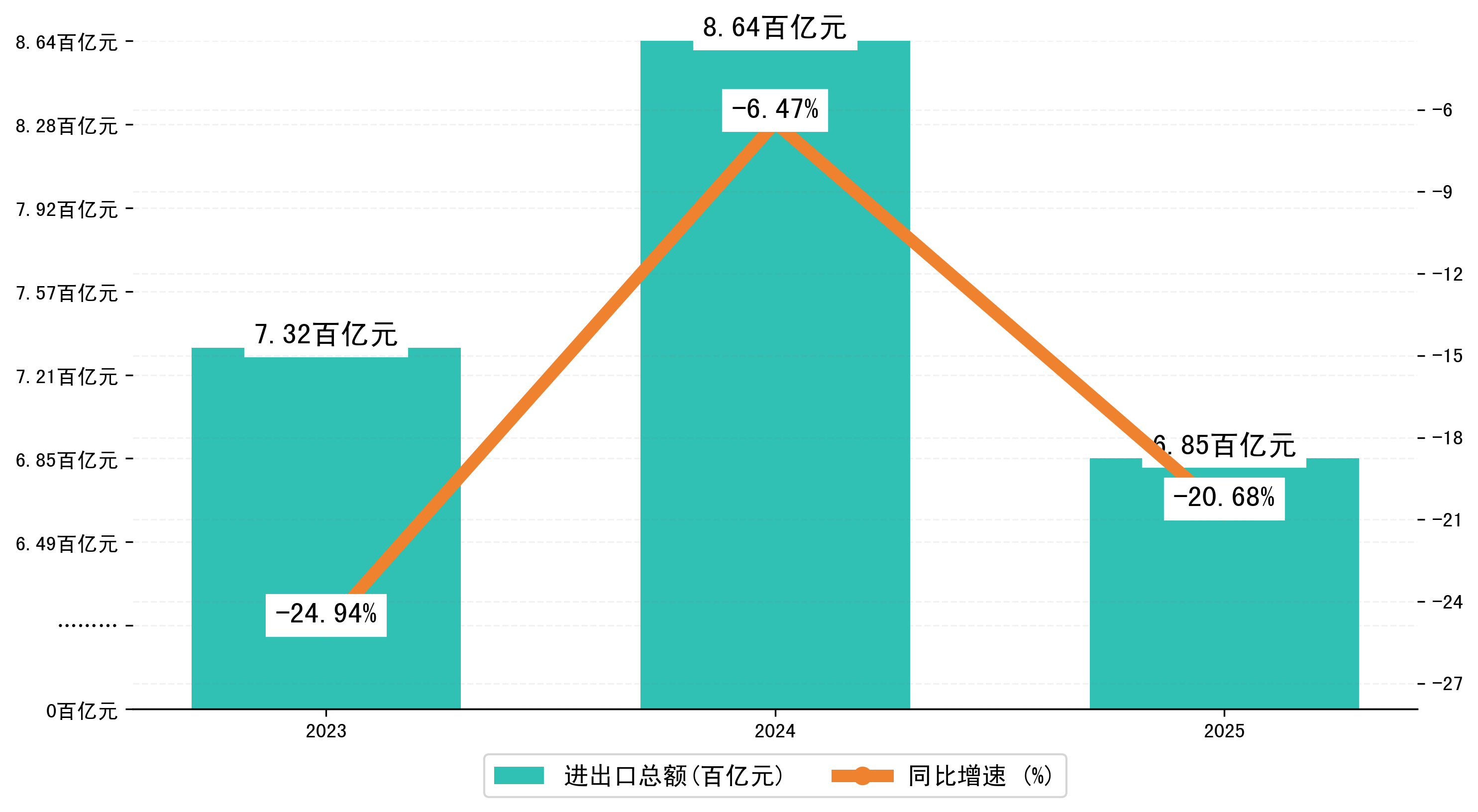 以人民币计,2025年1-6月山西省进出口总额为685,0784.2798万元,相比上年同期减少了178,6200.9824万元,同比减少了-20.80%。