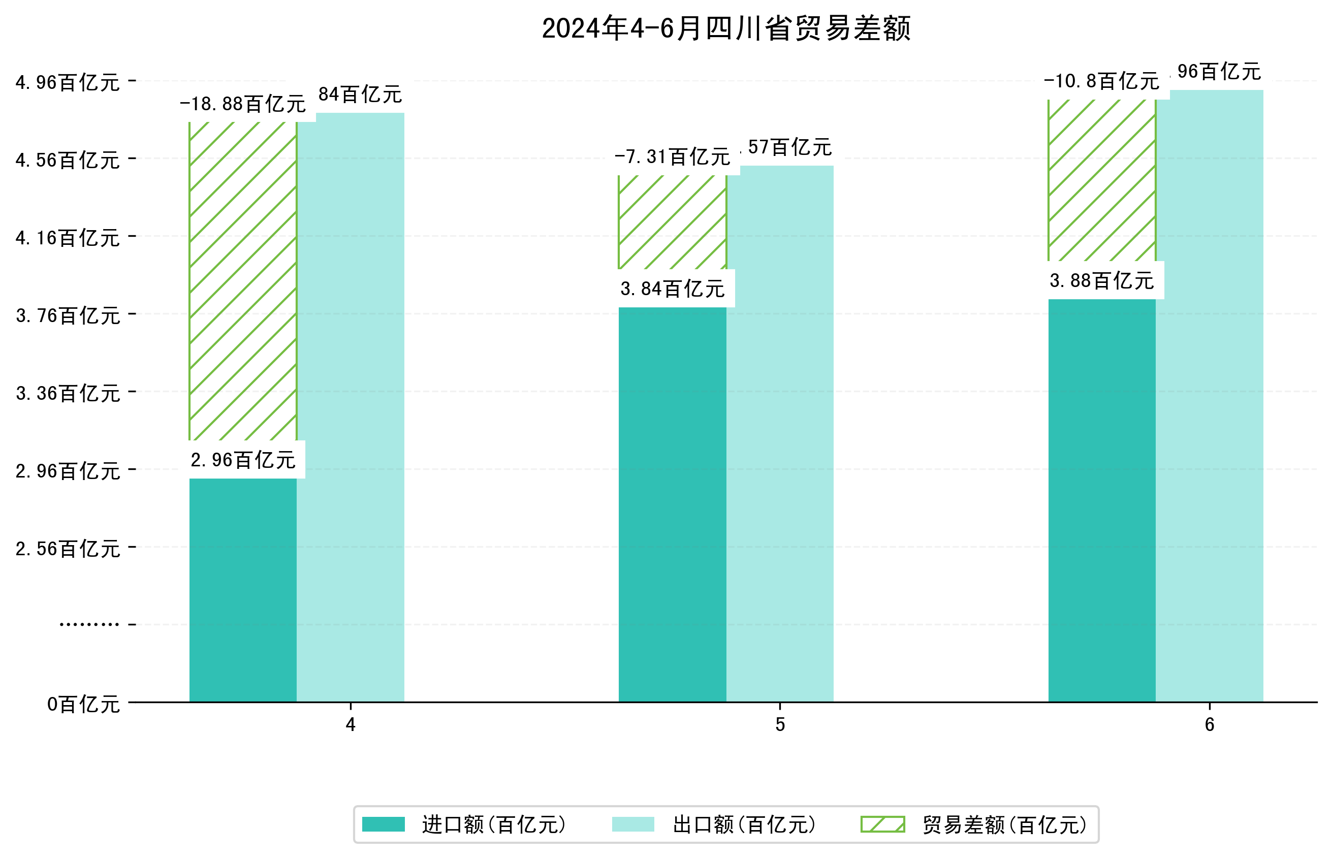 以美元计,2024年1-6月四川省进出口总额为690,7398.367万美元,相比上年同期增加了18,3287.0623万美元,同比增加5.60%。