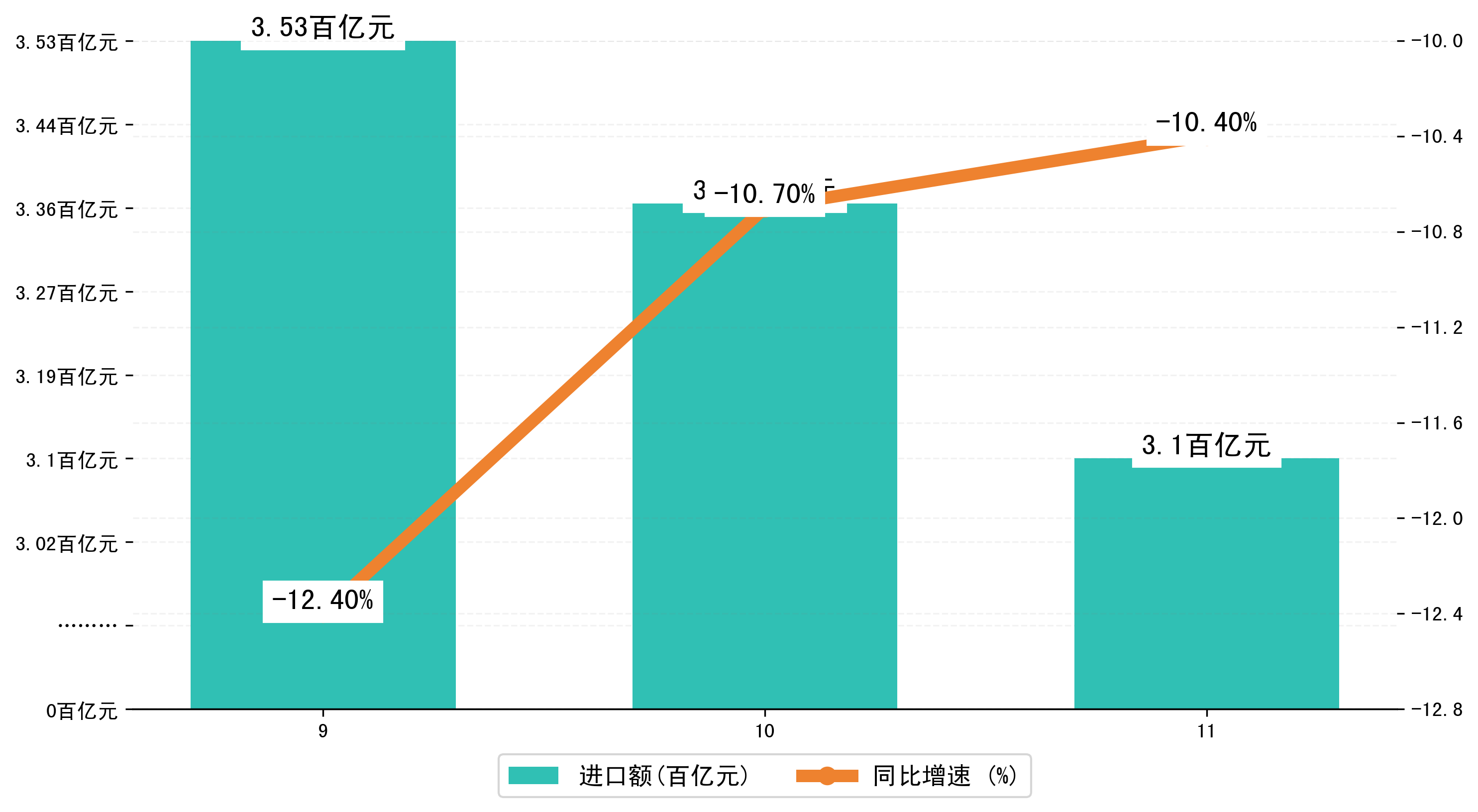 以人民币计,2023年11月四川省进口额为310,1668.1785万元,相比上月减少了26,0715.9988万元;相比上年同期减少了25,2034.9226万元,同比减少了-10.40%。