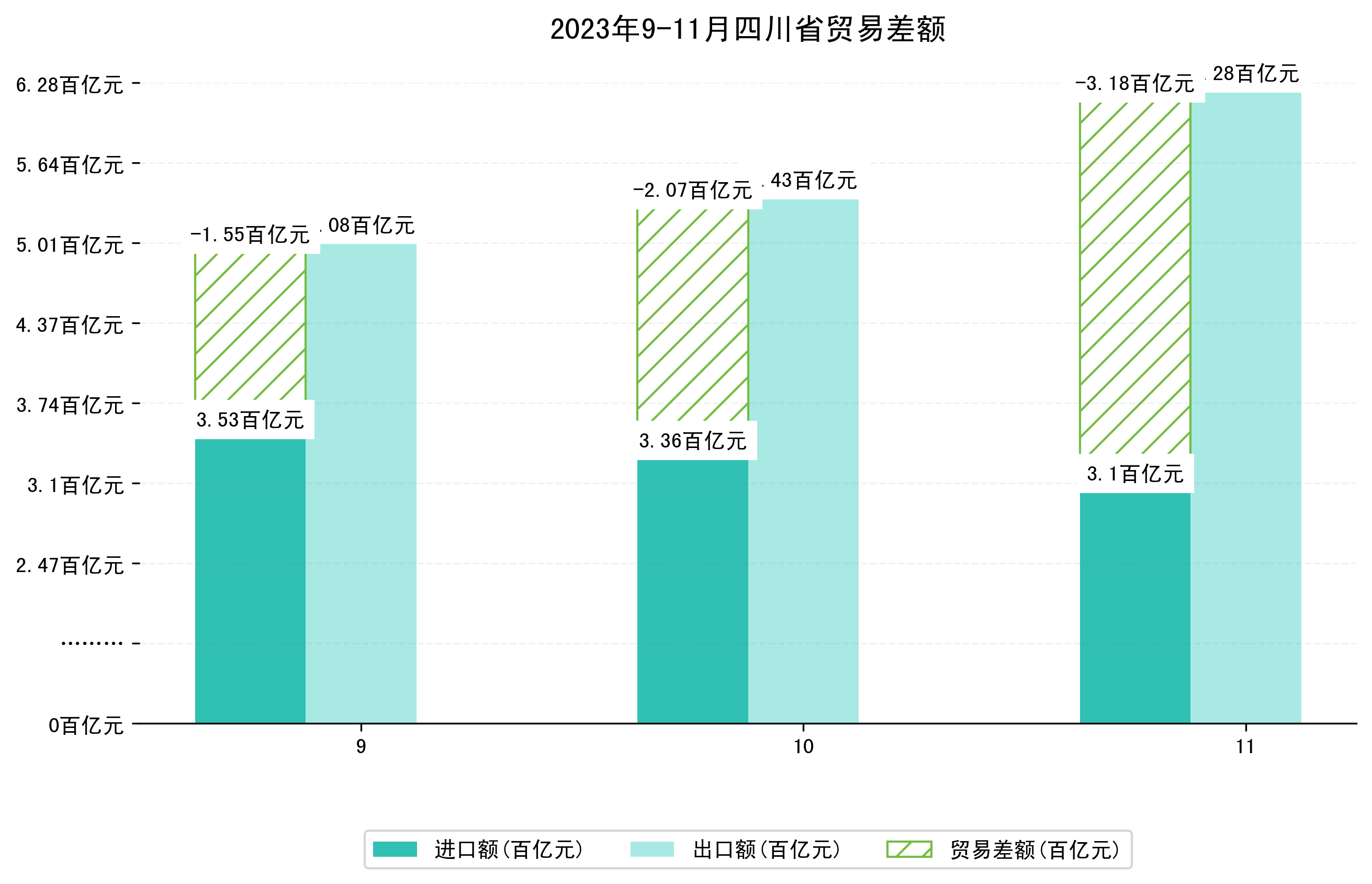 以美元计,2023年1-11月四川省贸易差额为322,0760,3302万美元(贸易顺差),相比上年同期增加了9,9290,3654万美元,同比增加3.18%。
