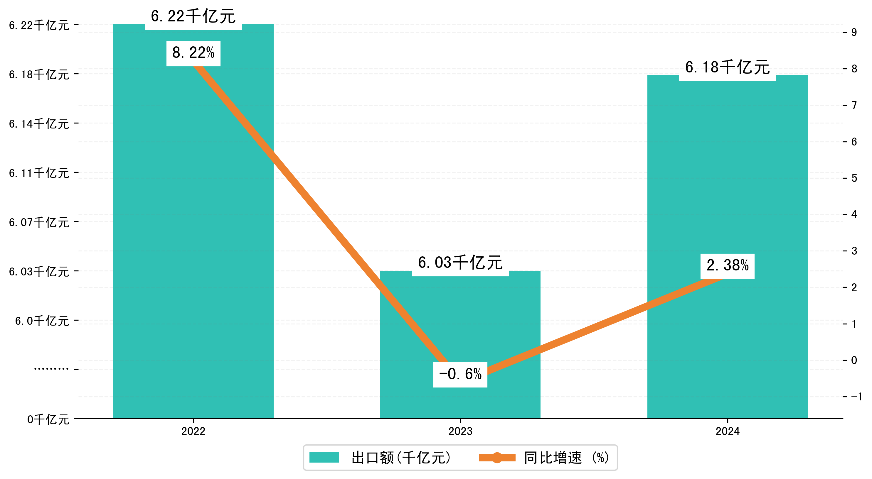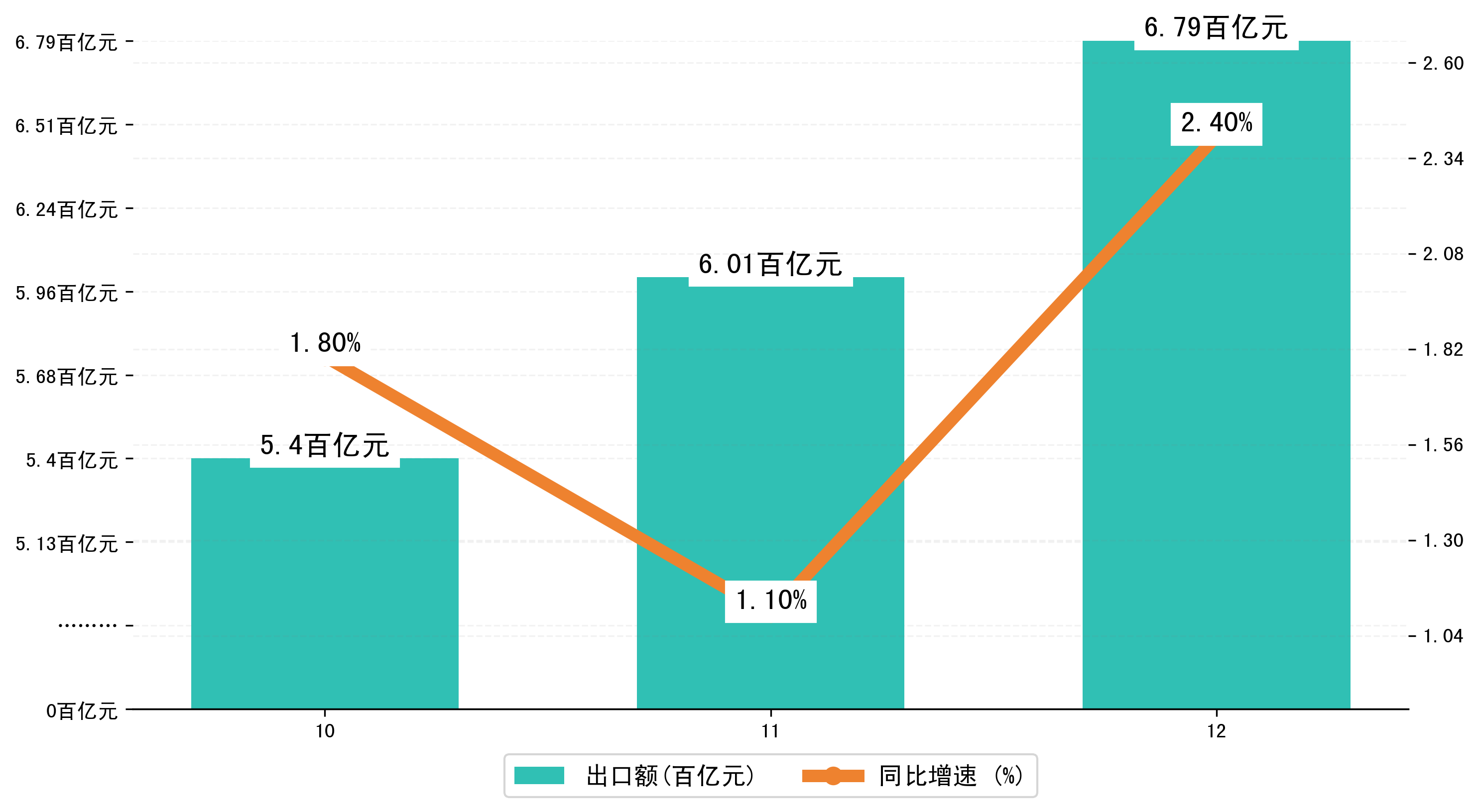 以人民币计,2024年1-12月四川省出口额为6177,6968.8977万元,相比上年同期增加了143,7838.5779万元,同比增加了2.40%。