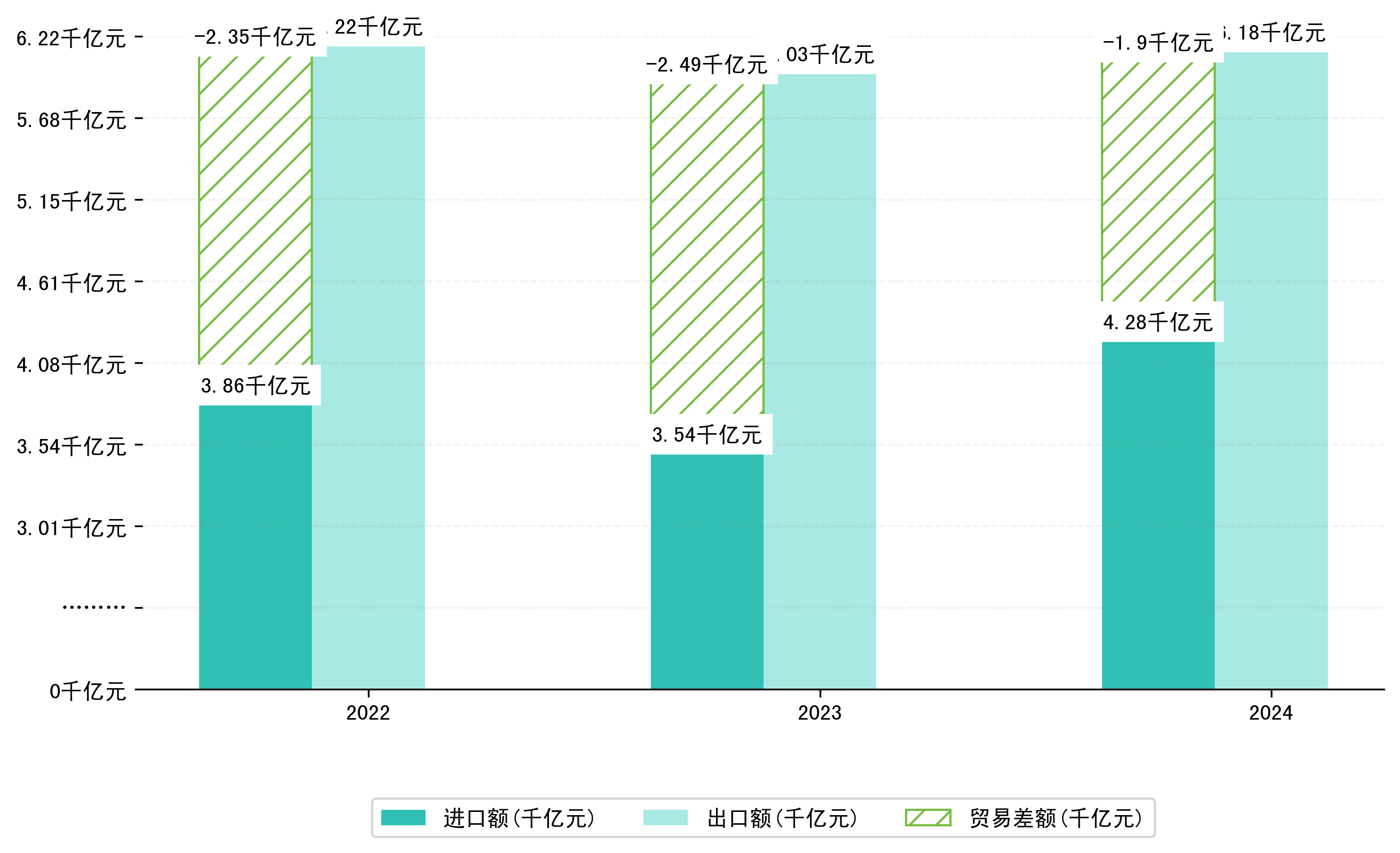 以美元计,2024年1-12月四川省进口额为601,2843.0504万美元,相比上年同期增加了98,2244.7891万美元,同比增加20.00%。