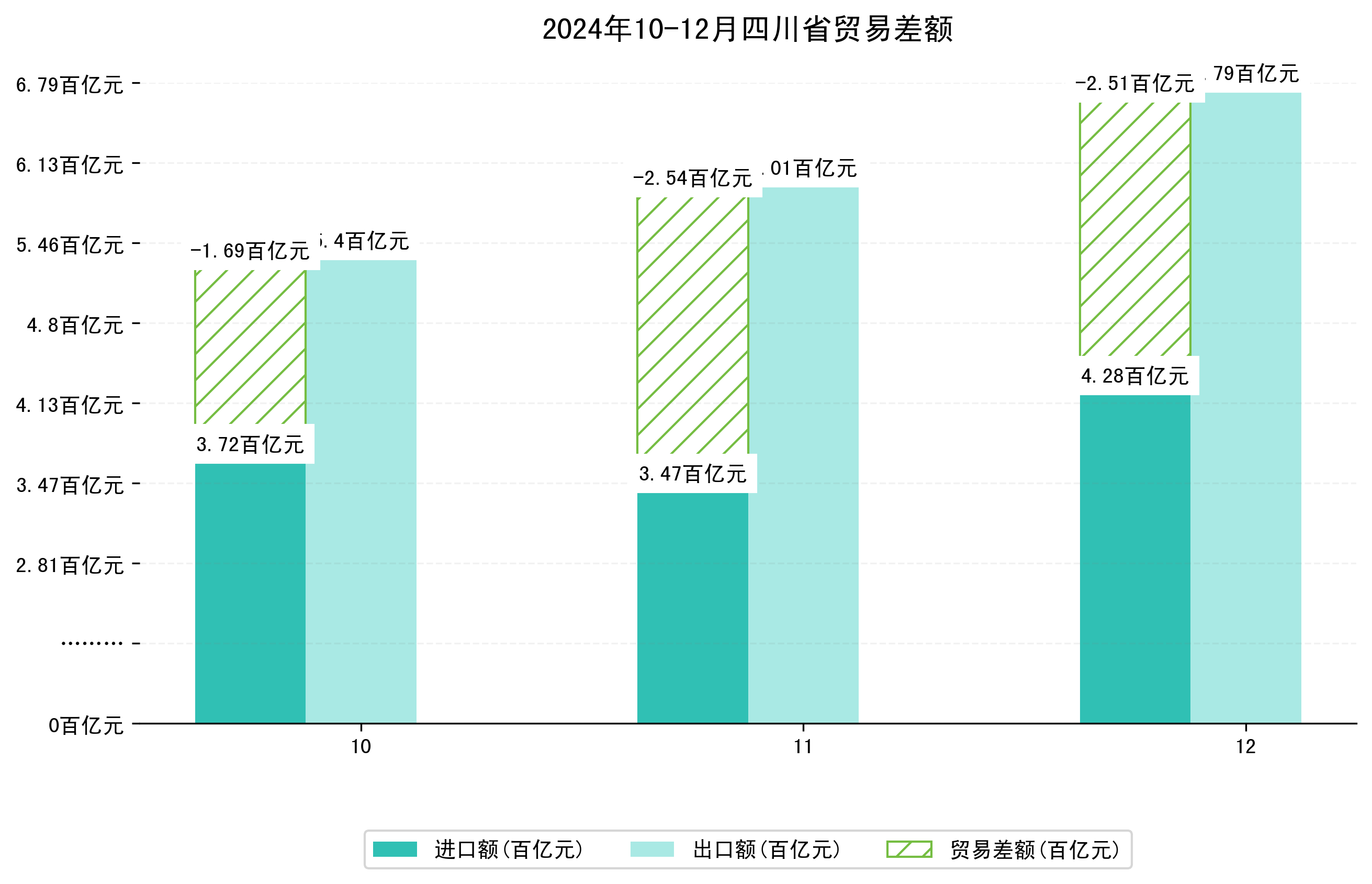 以人民币计,2024年12月四川省贸易差额为251,0243,7360万元(贸易顺差),相比上月减少了2,6374,5093万元,即7012,4769万美元;相比上年同期增加了13,1118,6148万元,同比增加5.51%。