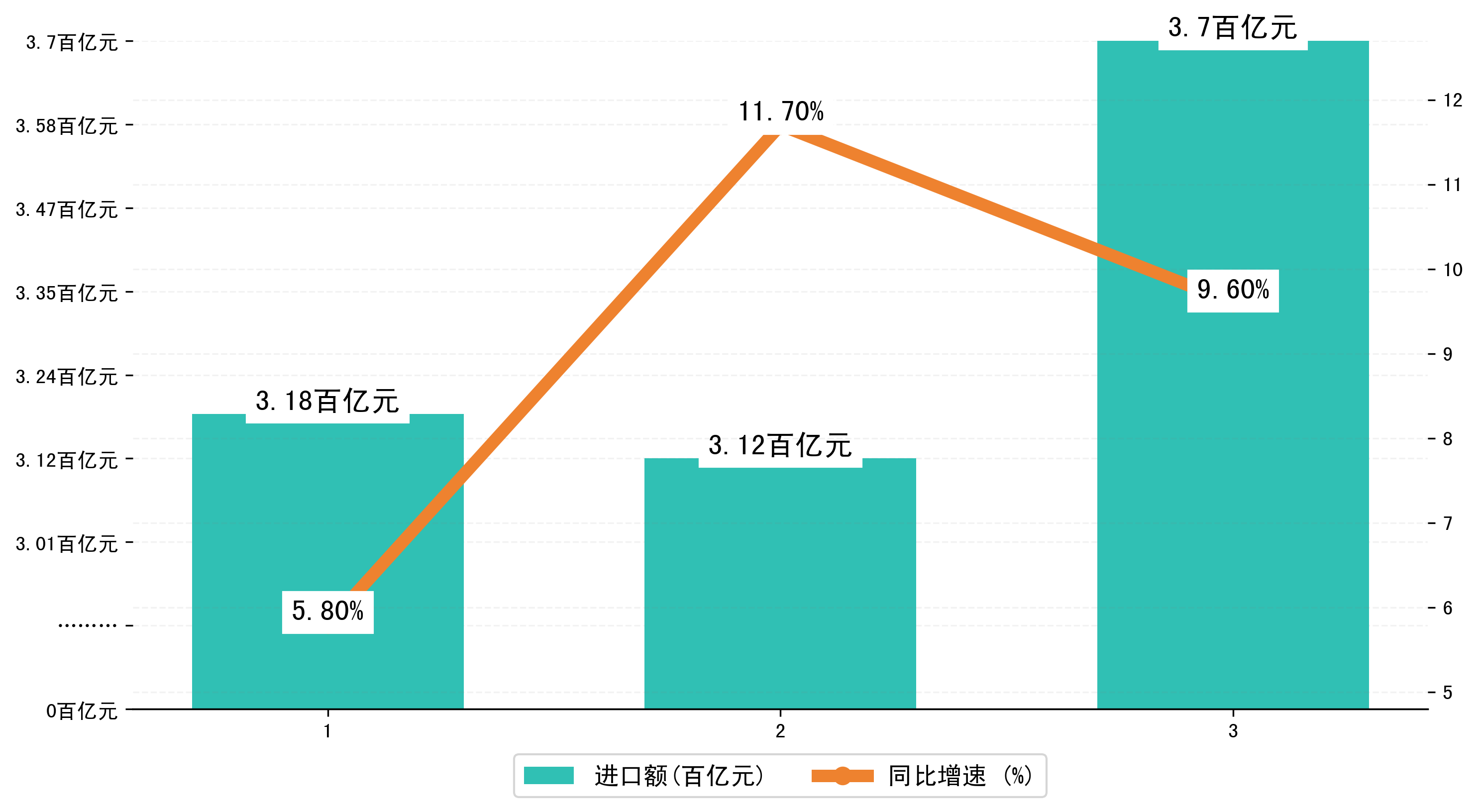 以人民币计,2025年3月四川省进口额为369,6746.7002万元,相比上月增加了57,2849.5931万元;相比上年同期增加了18,7470.8469万元,同比增加了9.60%。