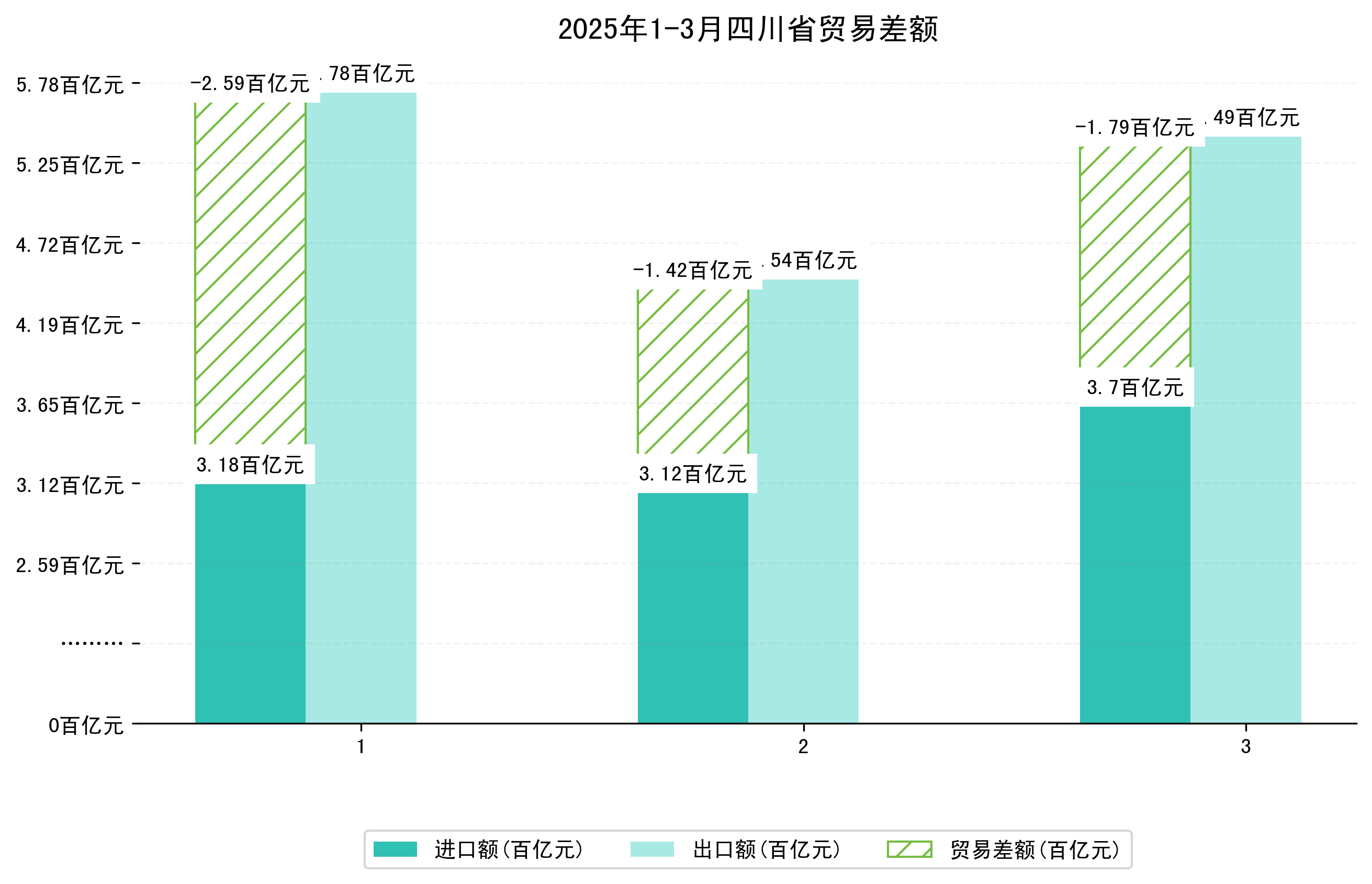 以人民币计,2025年3月四川省贸易差额为179,1010,2466万元(贸易顺差),相比上月增加了37,5634,4136万元,即5,2659,5635万美元;相比上年同期增加了50,3549,3207万元,同比增加39.11%。