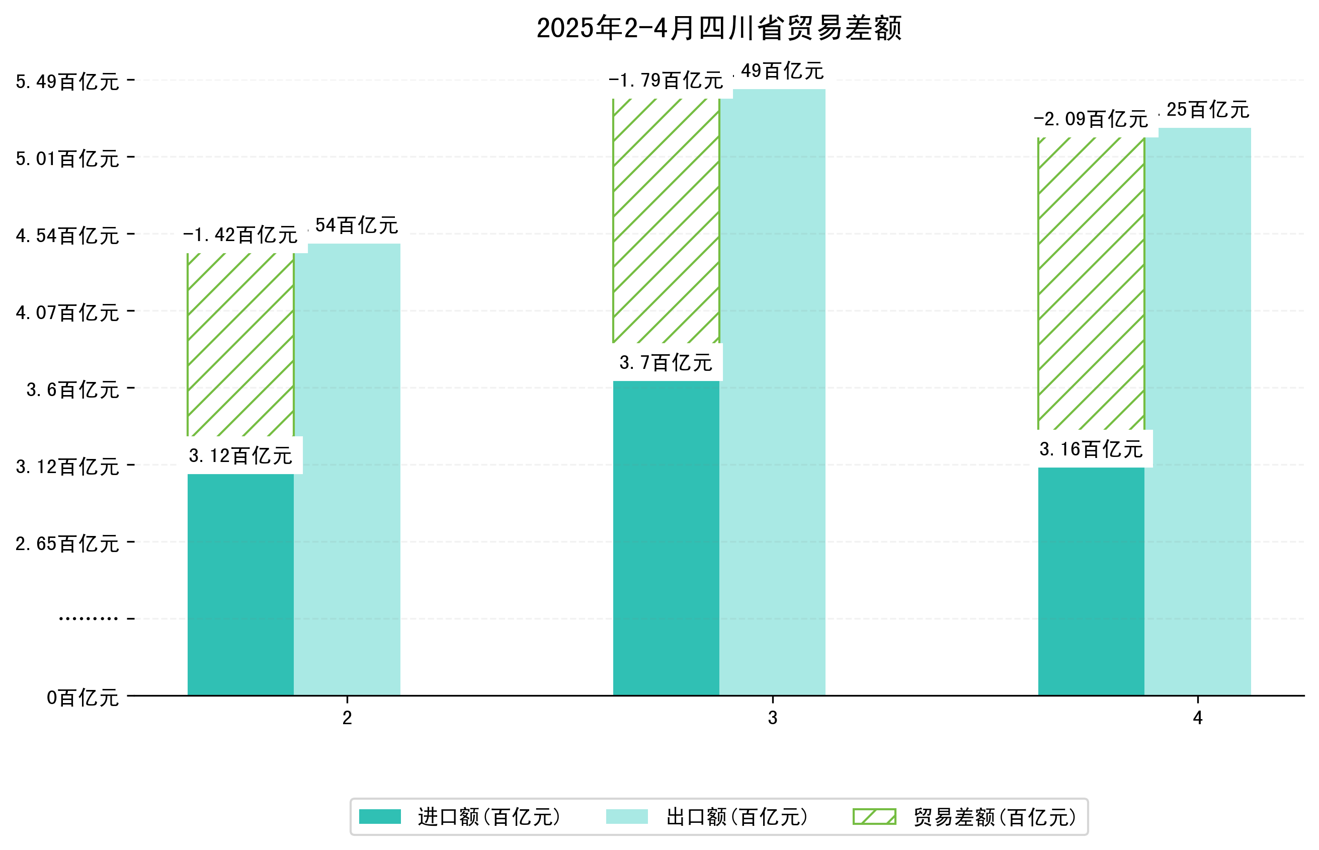 以美元计,2025年1-4月四川省贸易差额为109,4820,8813万美元(贸易顺差),相比上年同期增加了3,8282,1305万美元,同比增加3.62%。
