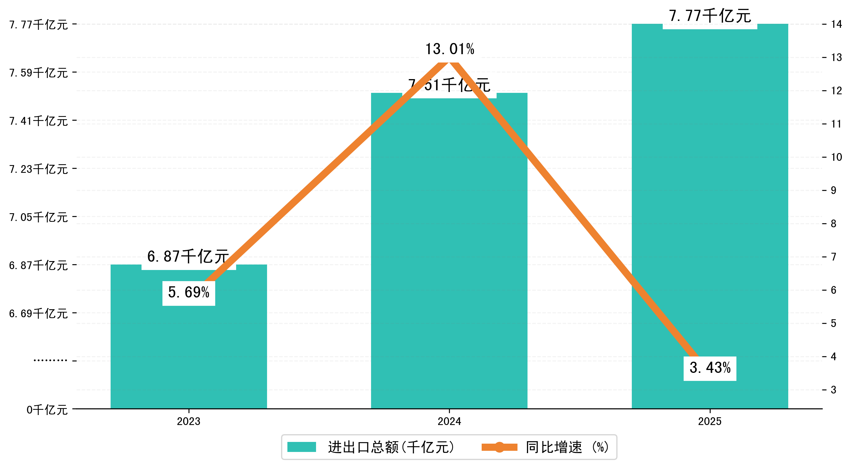 以人民币计,2025年1-9月四川省进出口总额为7767,8518.4141万元,相比上年同期增加了257,2467.2713万元,同比增加了3.60%。