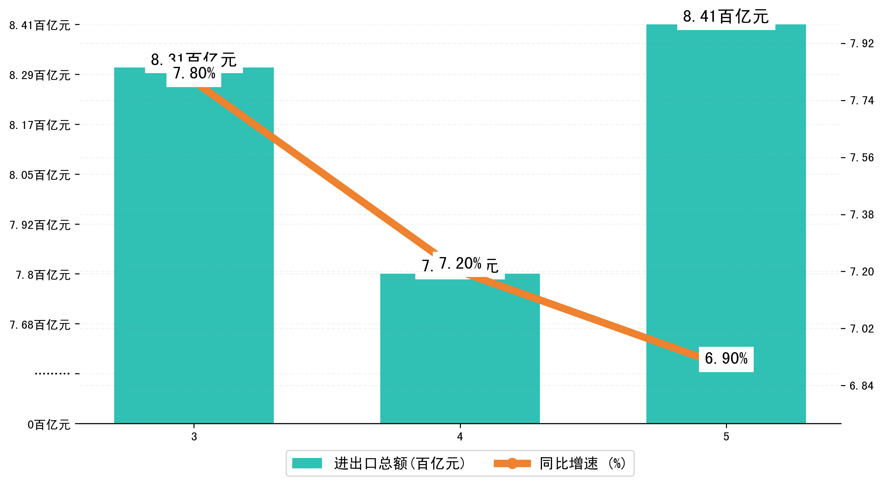 以人民币计,2024年5月四川省进出口总额为841,1945.1425万元,相比上月增加了61,0334.9732万元;相比上年同期增加了45,7762.9647万元,同比增加了6.90%。