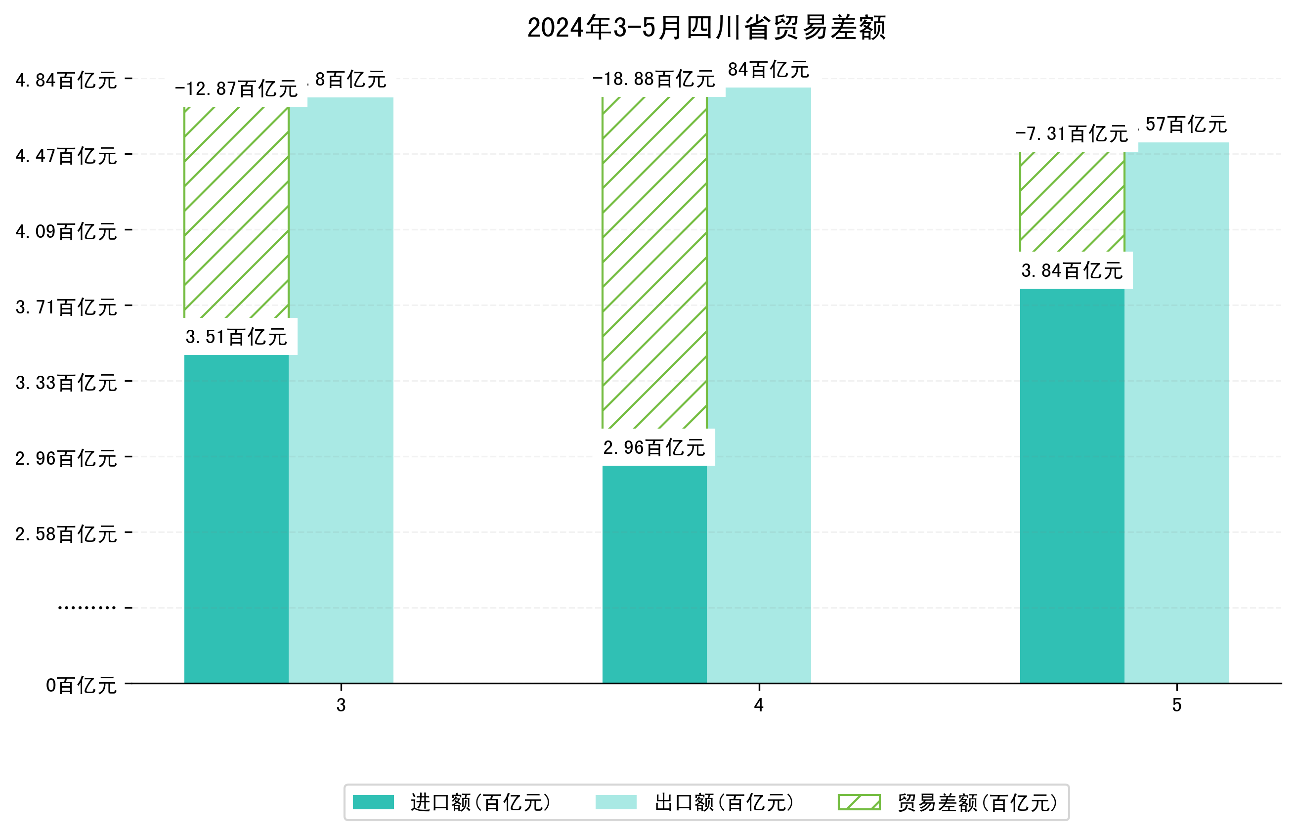以人民币计,2024年1-5月四川省贸易差额为824,5931,3165万元(贸易顺差),相比上年同期减少了429,0708,9801万元,同比减少-34.23%。