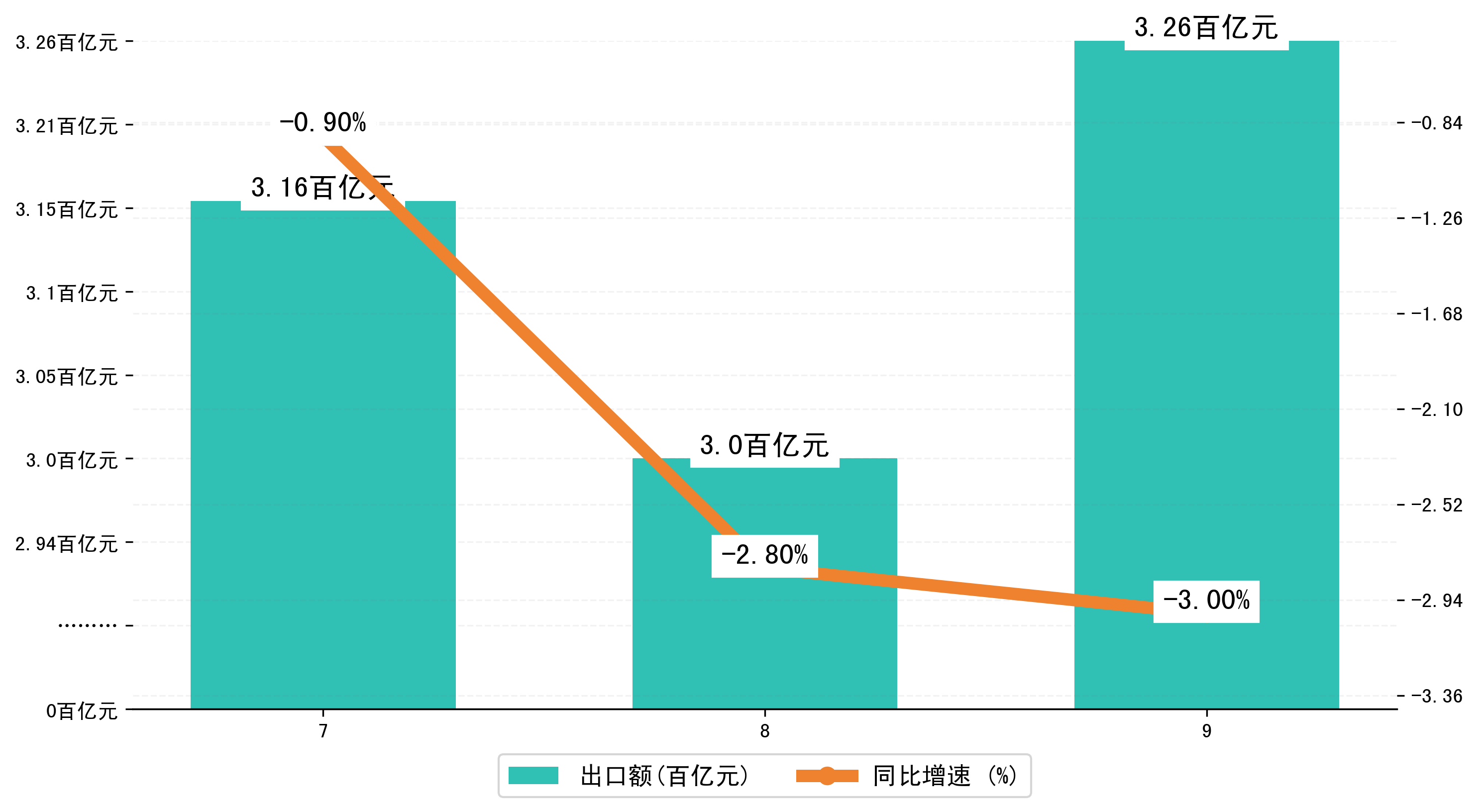 以人民币计,2023年9月天津市出口额为325,9692.8199万元,相比上月增加了26,3346.5803万元;相比上年同期减少了35,7976.6141万元,同比减少了-3.00%。