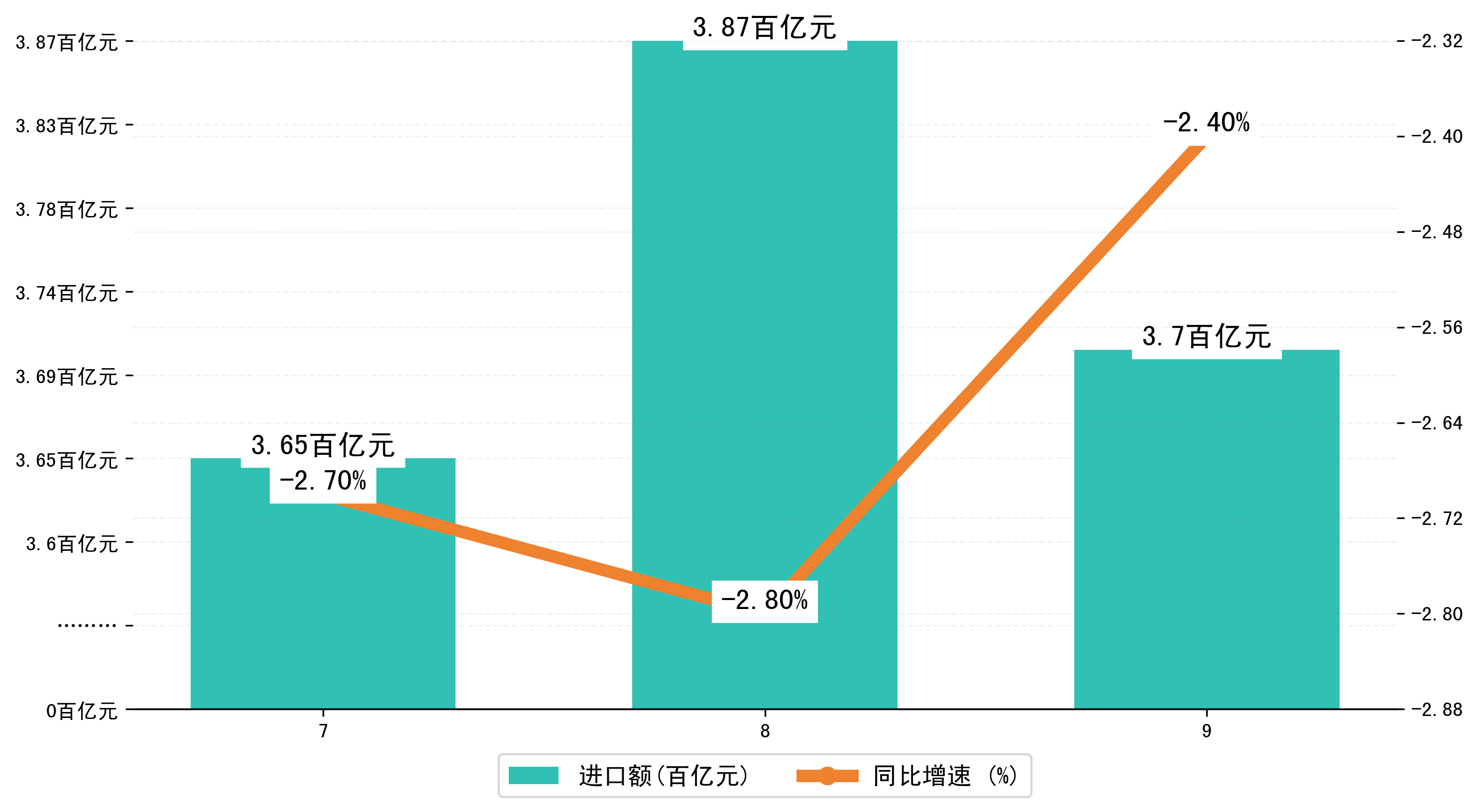 以人民币计,2023年9月天津市进口额为370,4055.533万元,相比上月减少了16,6637.1218万元;相比上年同期减少了18,0765.8217万元,同比减少了-2.40%。