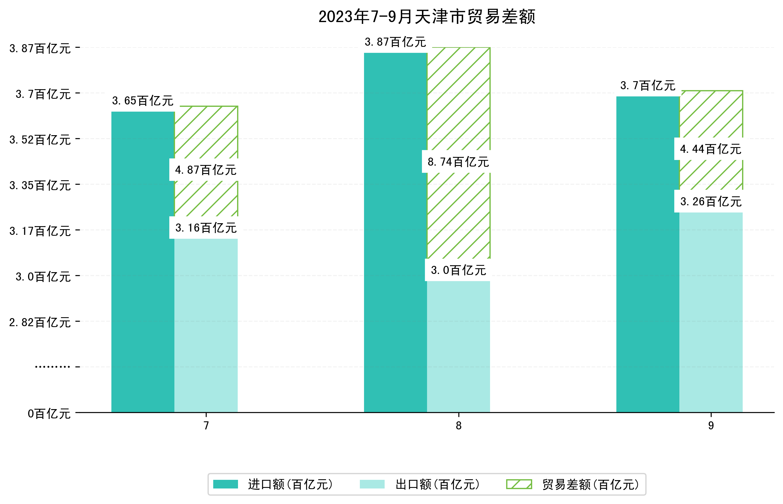 以人民币计,2023年9月天津市贸易差额为44,4362,7131万元(贸易逆差),相比上月增加了42,9983,7021万元,即5,9191,0051万美元;相比上年同期减少了17,7210,7924万元,同比减少66.33%。