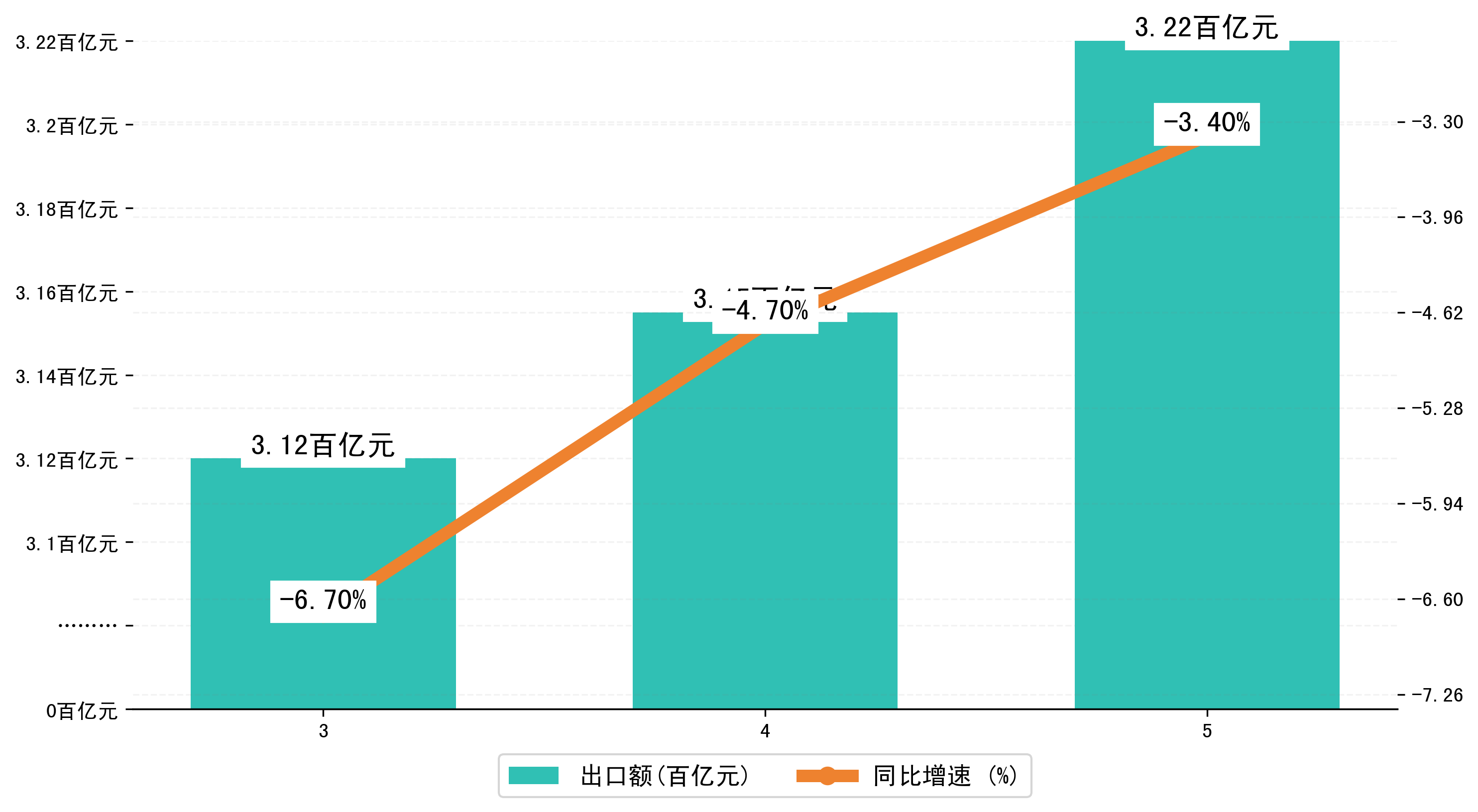以人民币计,2023年5月天津市出口额为322,1381.7491万元,相比上月增加了6,7414.8368万元;相比上年同期增加了4,5415.1406万元,同比减少了-3.40%。