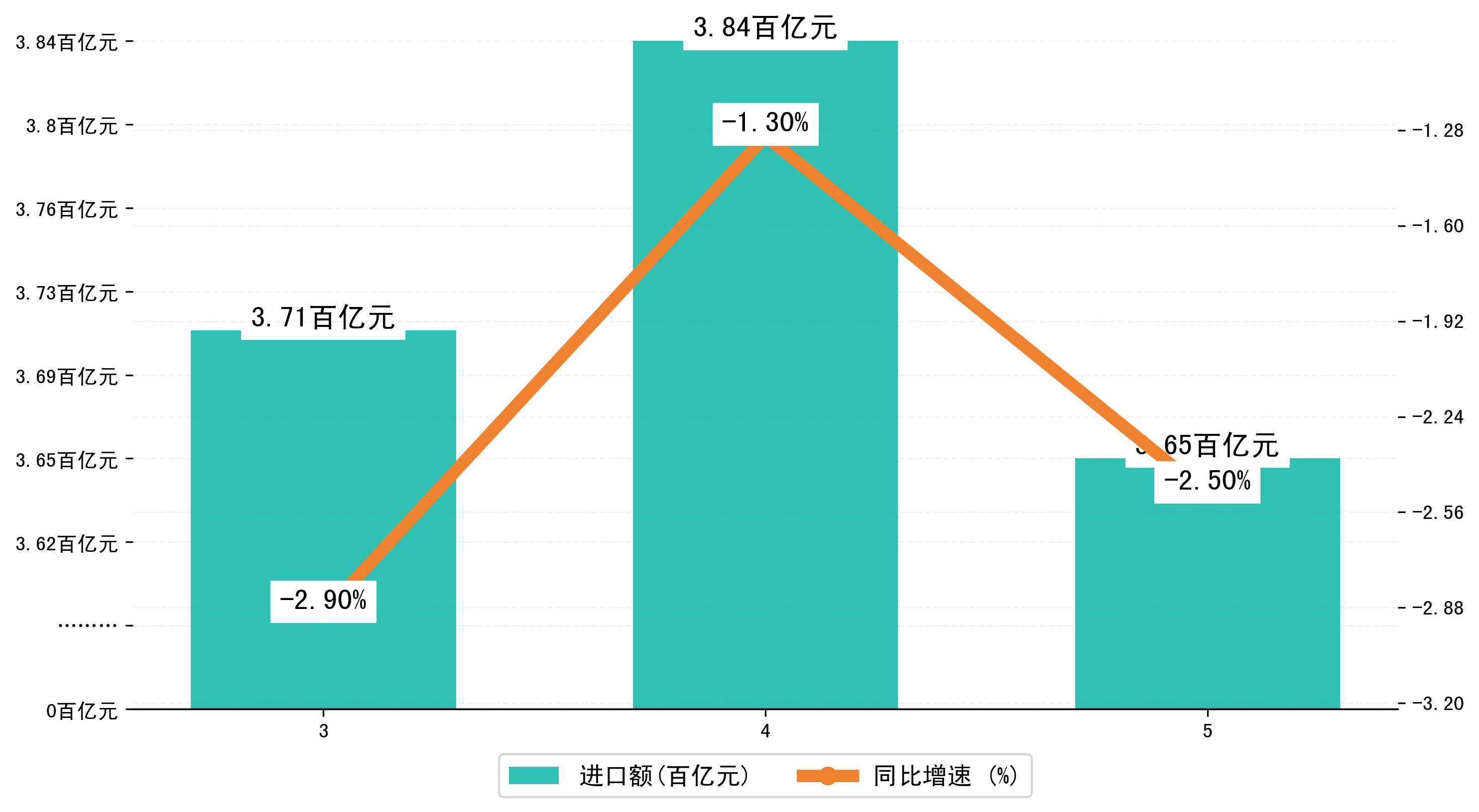 以人民币计,2023年5月天津市进口额为365,4969.9694万元,相比上月减少了18,0113.3055万元;相比上年同期减少了26,3260.8774万元,同比减少了-2.50%。
