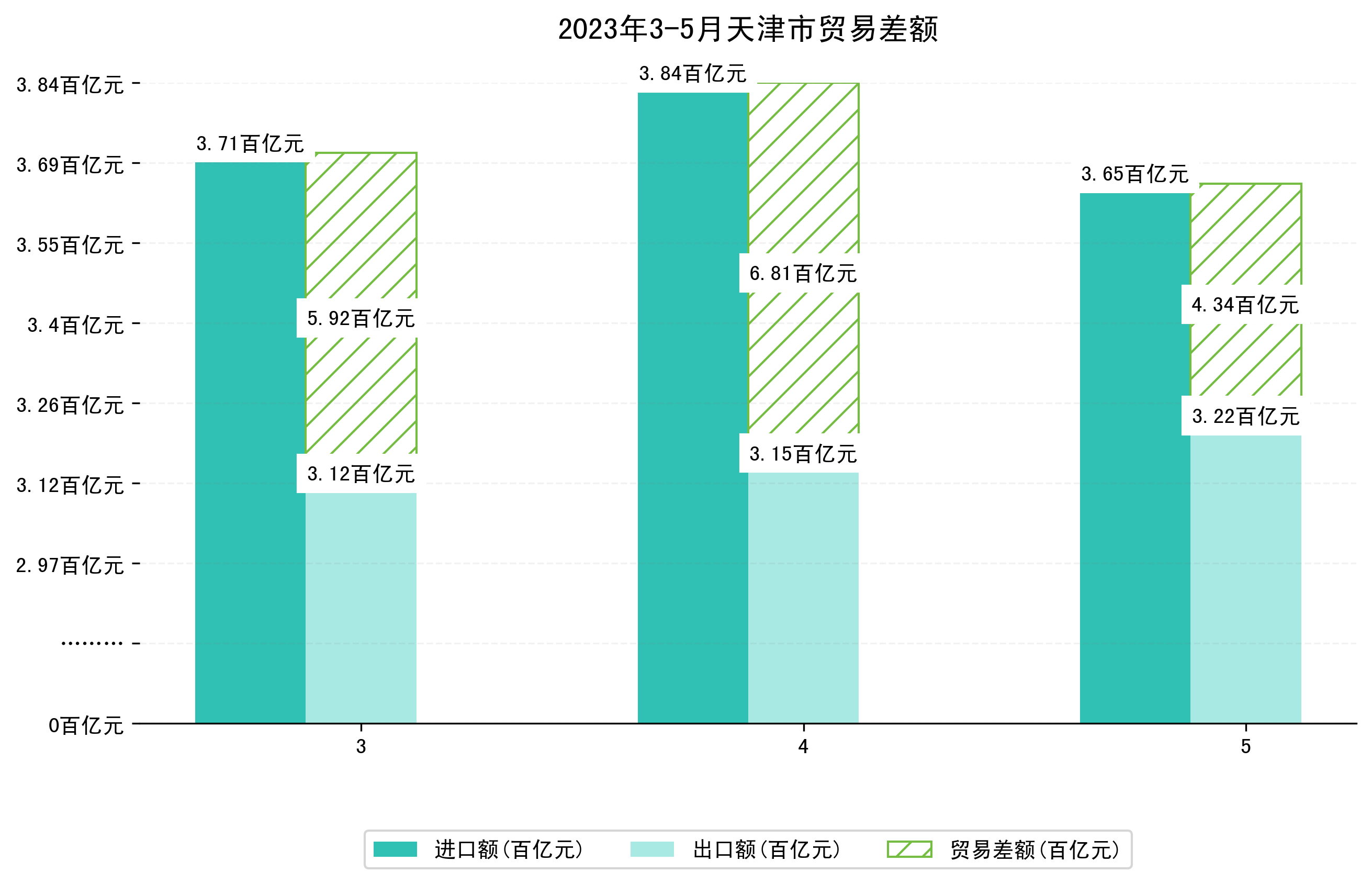 以人民币计,2023年5月天津市贸易差额为43,3588,2203万元(贸易逆差),相比上月增加了24,7528,1423万元,即3,6658,3775万美元;相比上年同期增加了30,8676,0180万元,同比增加-41.59%。