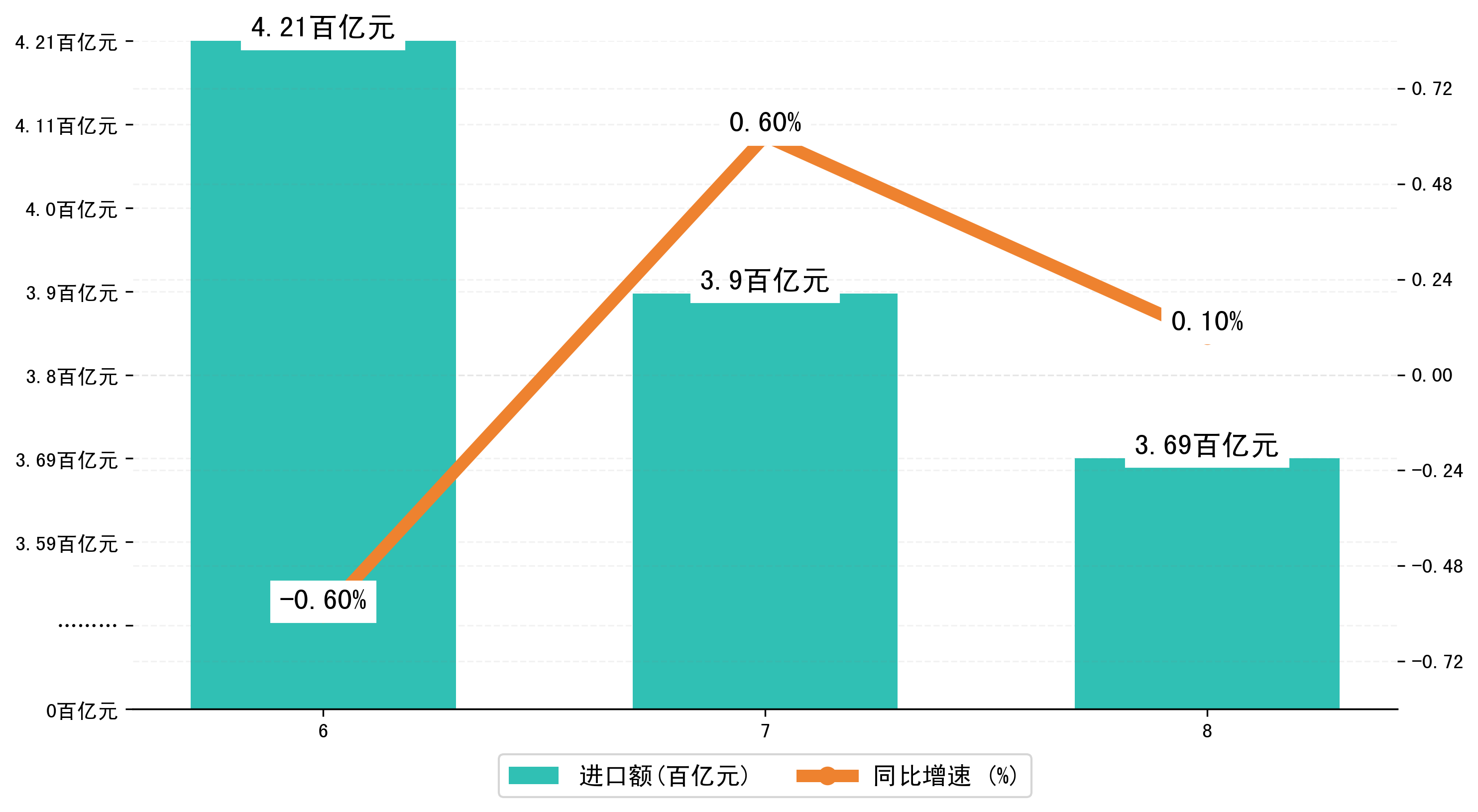 以美元计,2024年1-8月天津市进口额为402,7983.8155万美元,相比上年同期减少了8,5846.2531万美元,同比增加-2.00%。