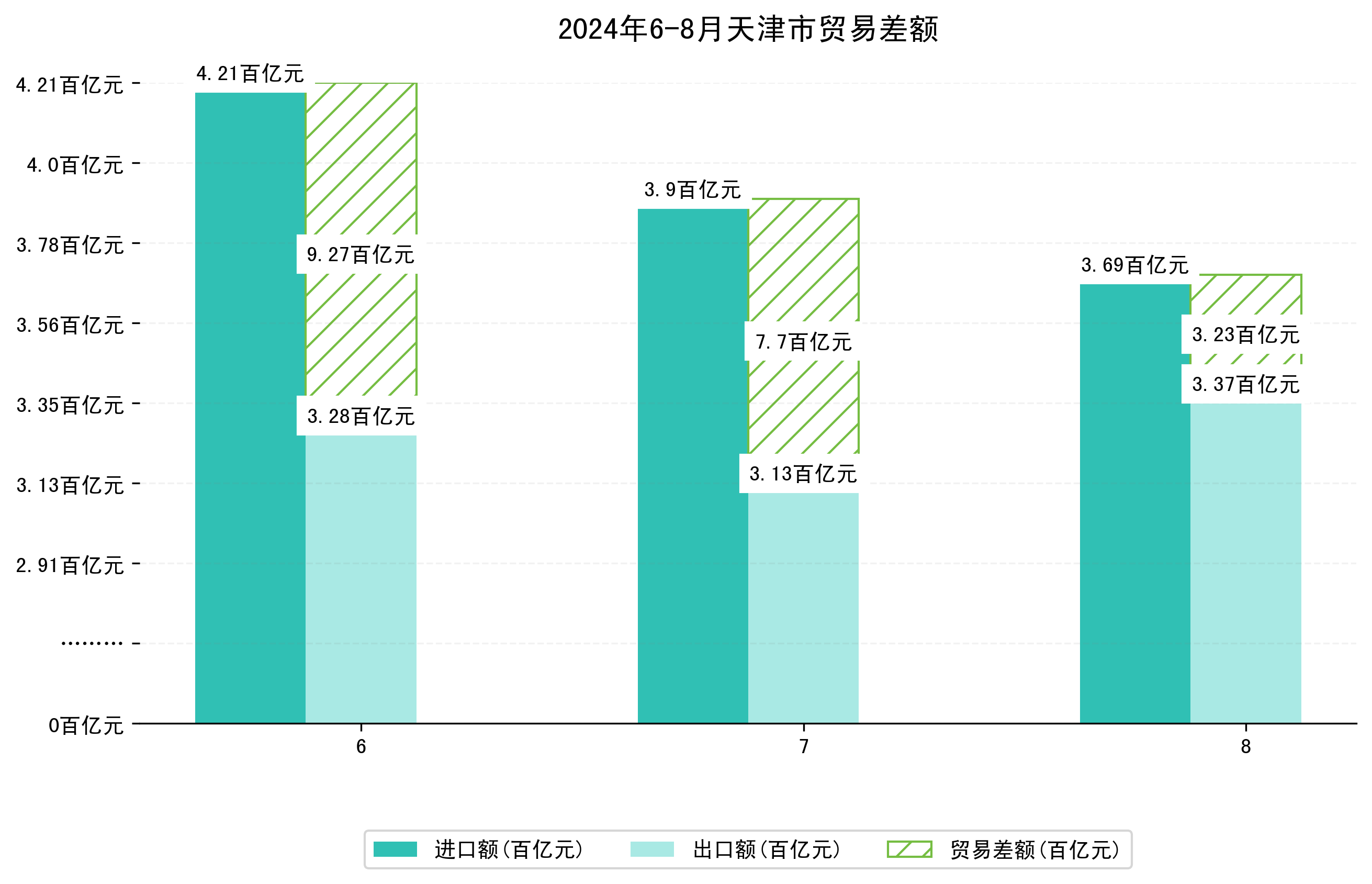 以人民币计,2024年8月天津市进出口总额为706,4169.7026万元,相比上月增加了3,7851.1246万元;相比上年同期增加了19,7130.8081万元,同比增加了2.20%。
