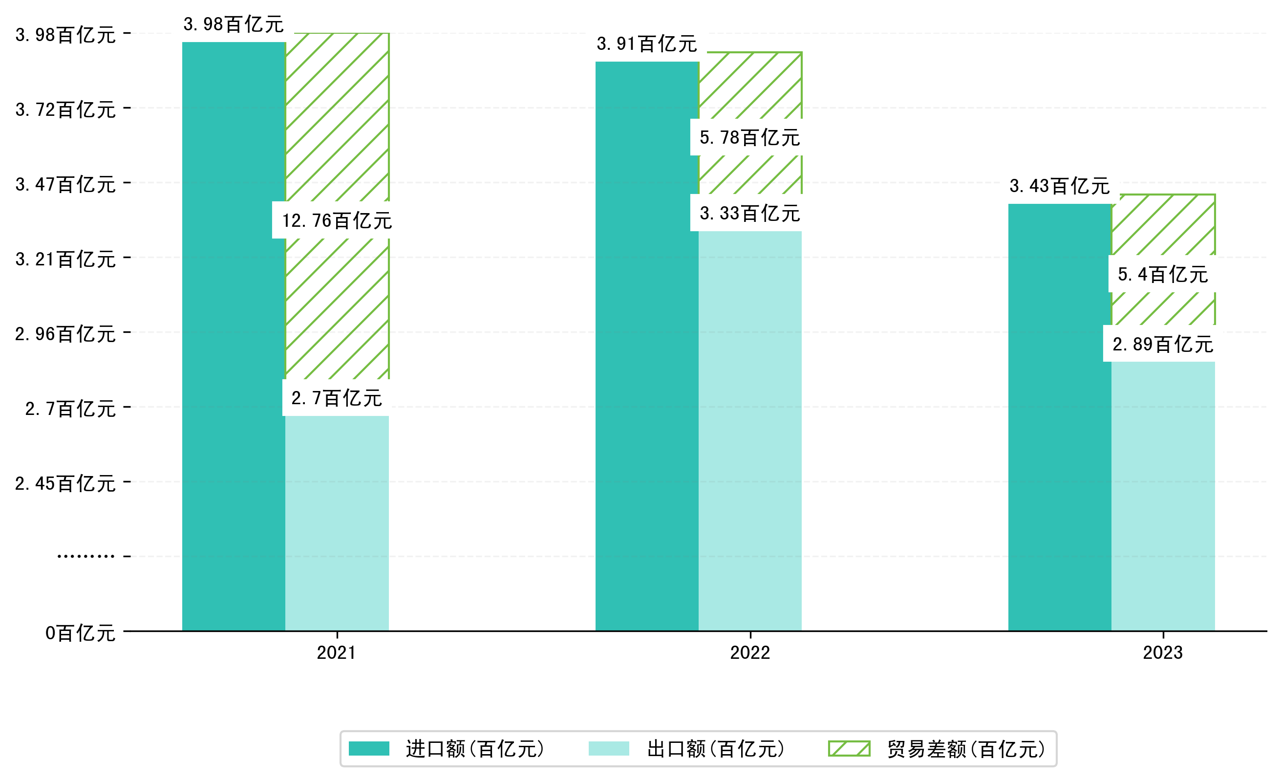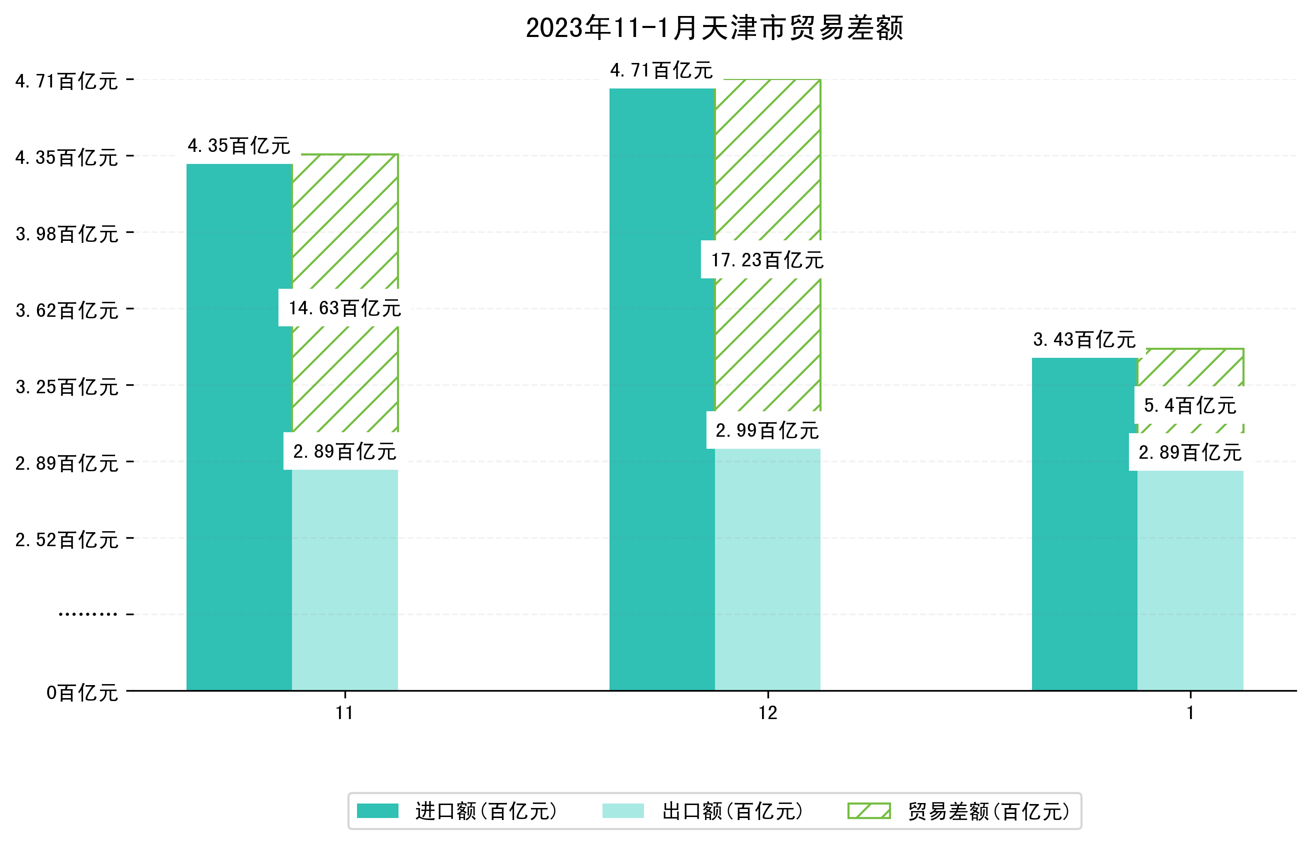以人民币计,2023年1-1月天津市贸易差额为53,9647,4349万元(贸易逆差),相比上年同期增加了3,8524,7005万元,同比增加-6.66%。