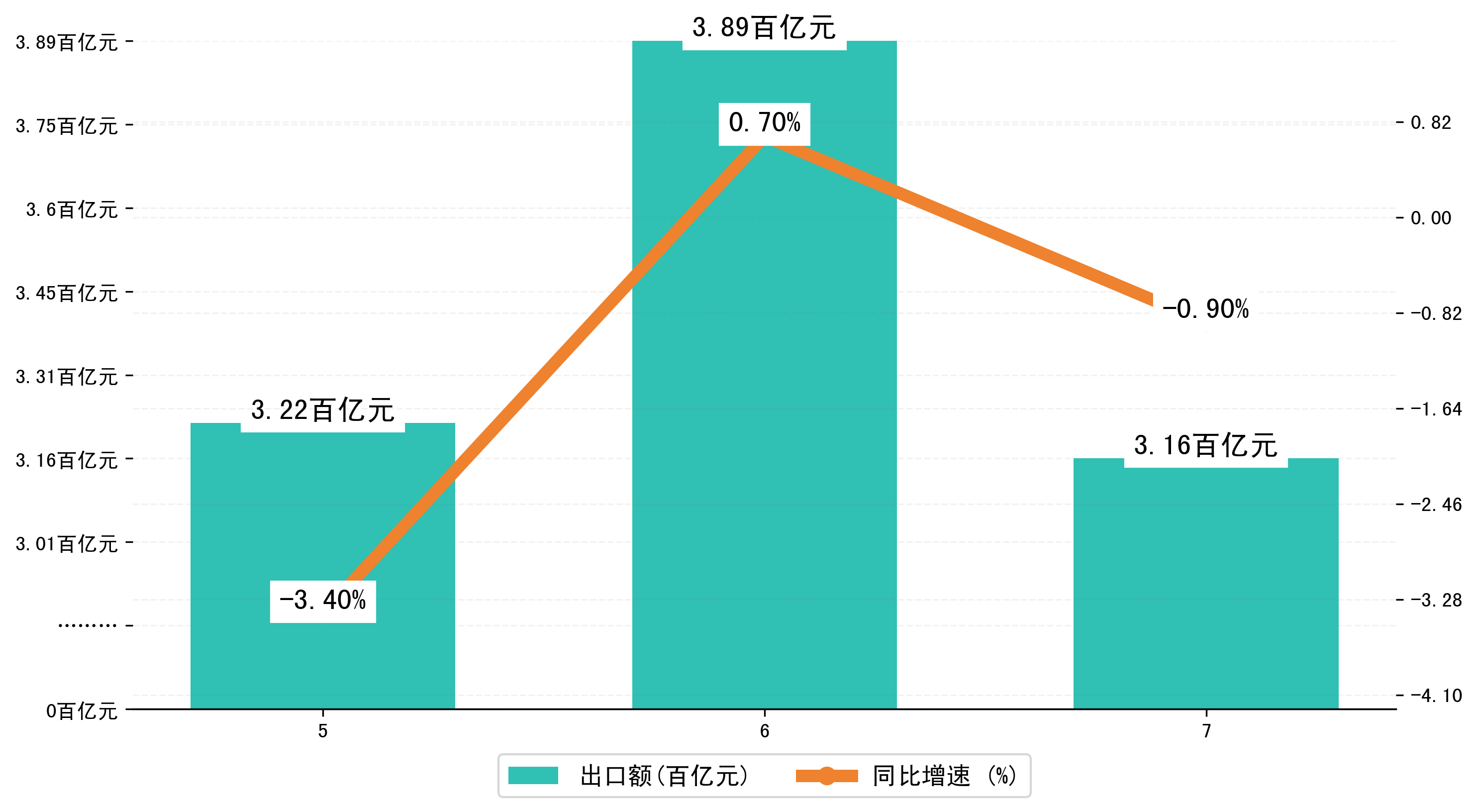 以人民币计,2023年7月天津市出口额为315,8696.1275万元,相比上月减少了73,4138.0524万元;相比上年同期减少了33,0559.9037万元,同比减少了-0.90%。