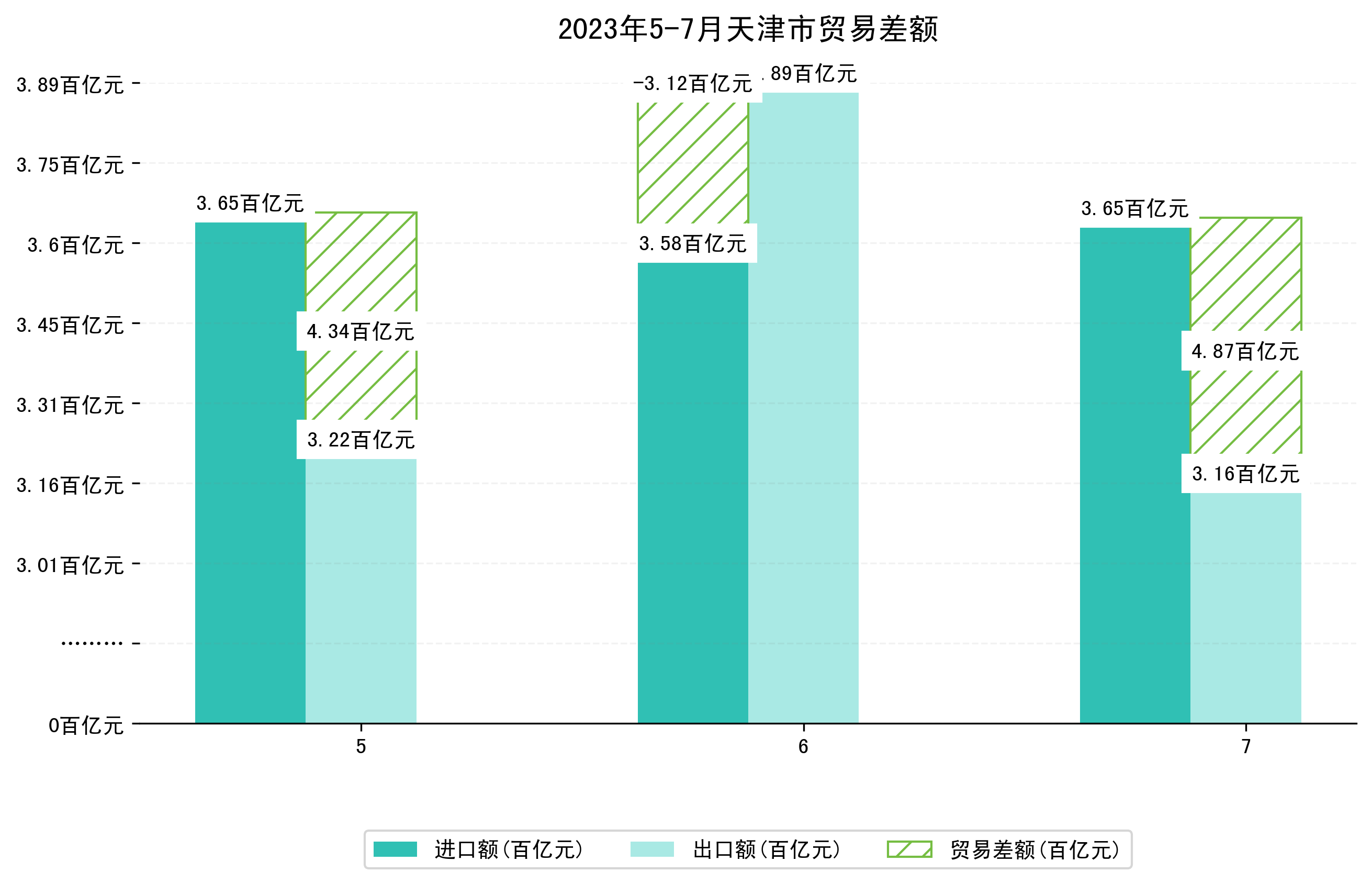 以美元计,2023年7月天津市贸易差额为6,7827,9078万美元(贸易逆差),相比上月减少了11,3161,6842万美元;相比上年同期减少了3,7667,0919万美元,同比减少124.89%。