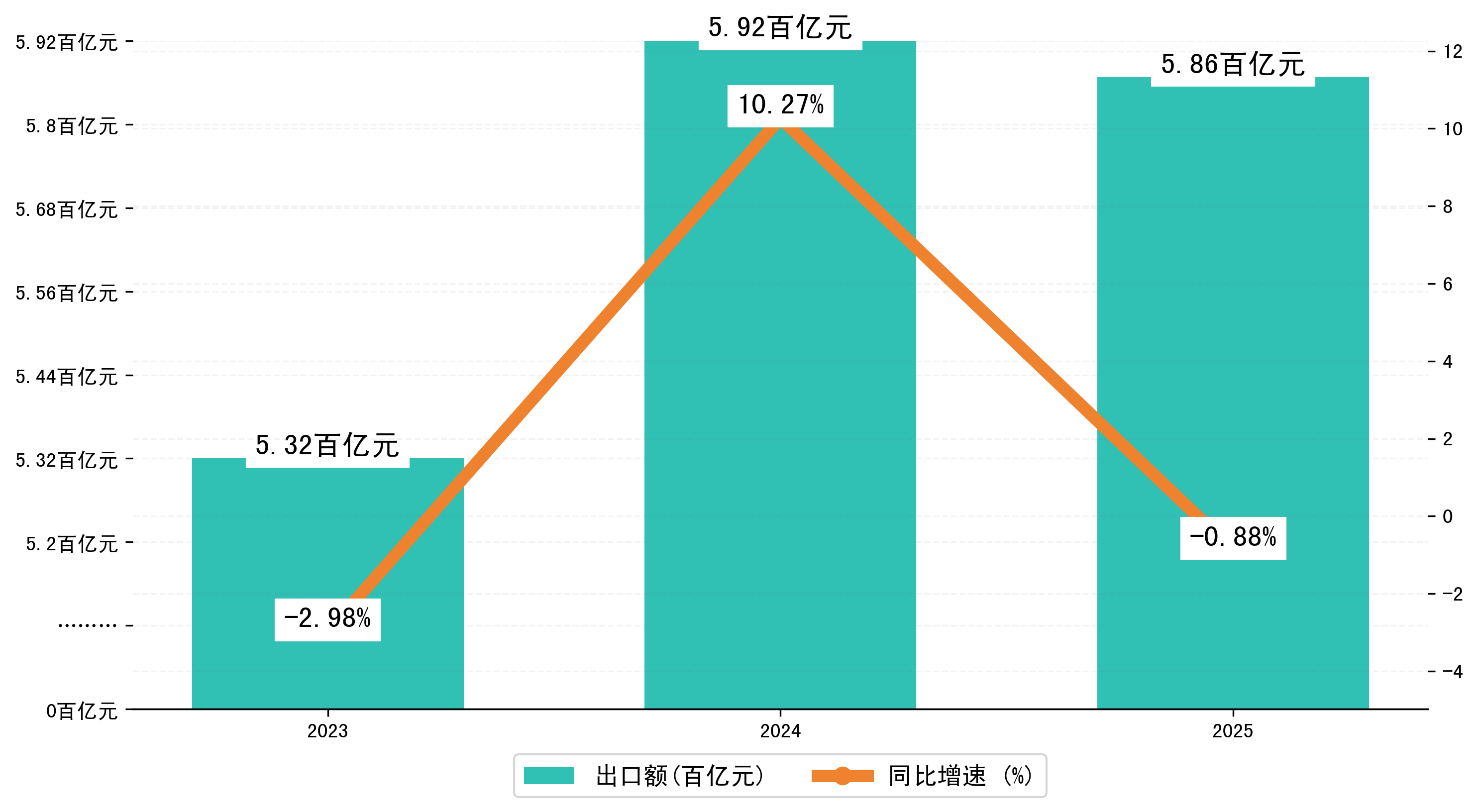 以人民币计,2025年1-2月天津市出口额为586,3163.6398万元,相比上年同期减少了5,2208.8499万元,同比减少了-0.90%。