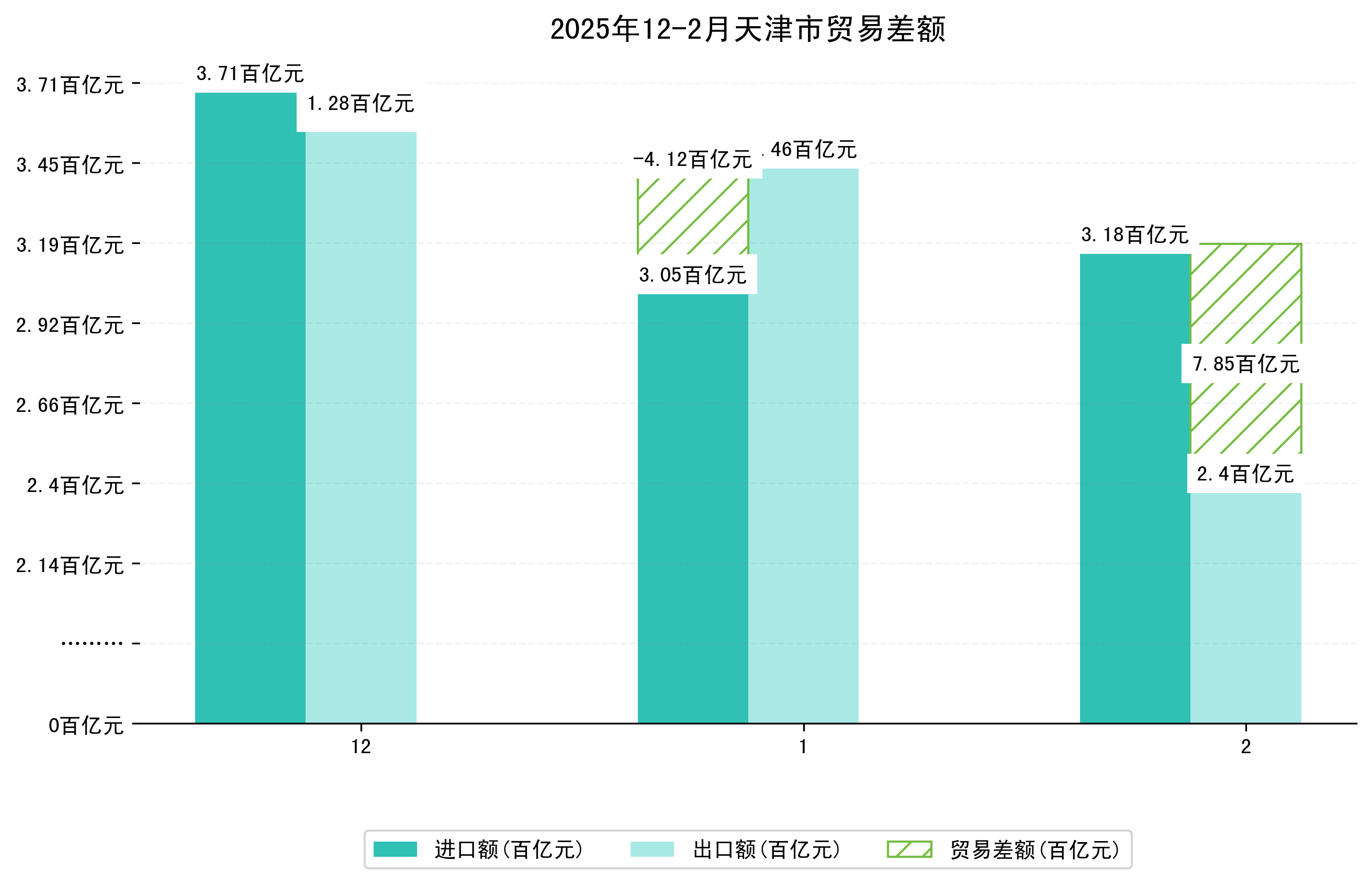 以人民币计,2025年1-2月天津市贸易差额为37,3493,0532万元(贸易逆差),相比上年同期减少了14,1449,7189万元,同比减少60.96%。