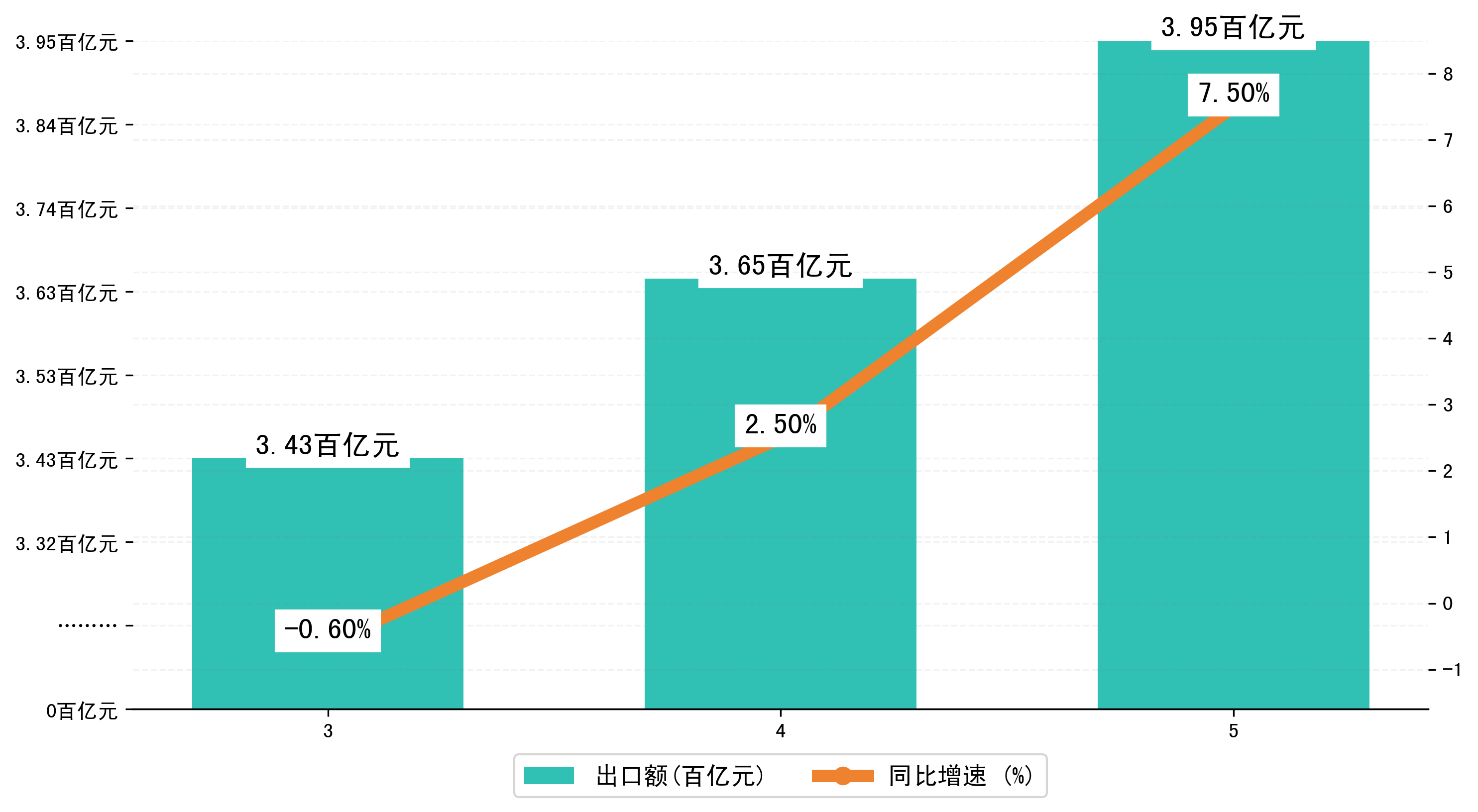 以人民币计,2025年5月天津市出口额为394,6301.0245万元,相比上月增加了29,6350.0125万元;相比上年同期增加了86,3149.538万元,同比增加了7.50%。