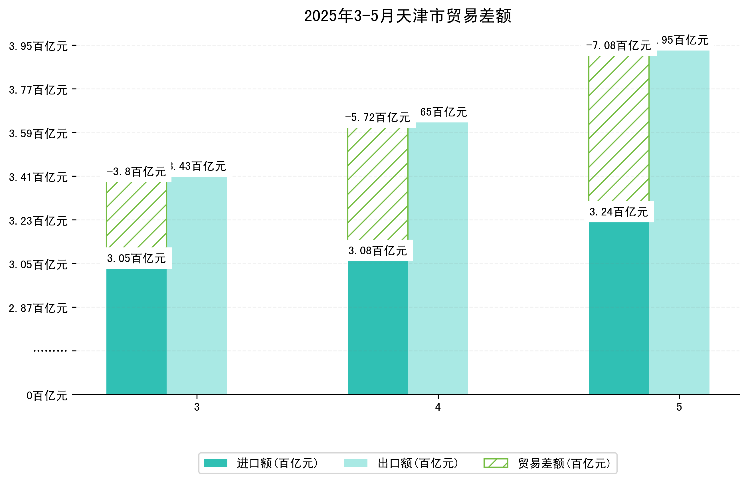 以美元计,2025年5月天津市贸易差额为9,8047,5355万美元(贸易顺差),相比上月增加了1,8015,8291万美元;相比上年同期增加了14,0962,6754万美元,同比增加-328.47%。