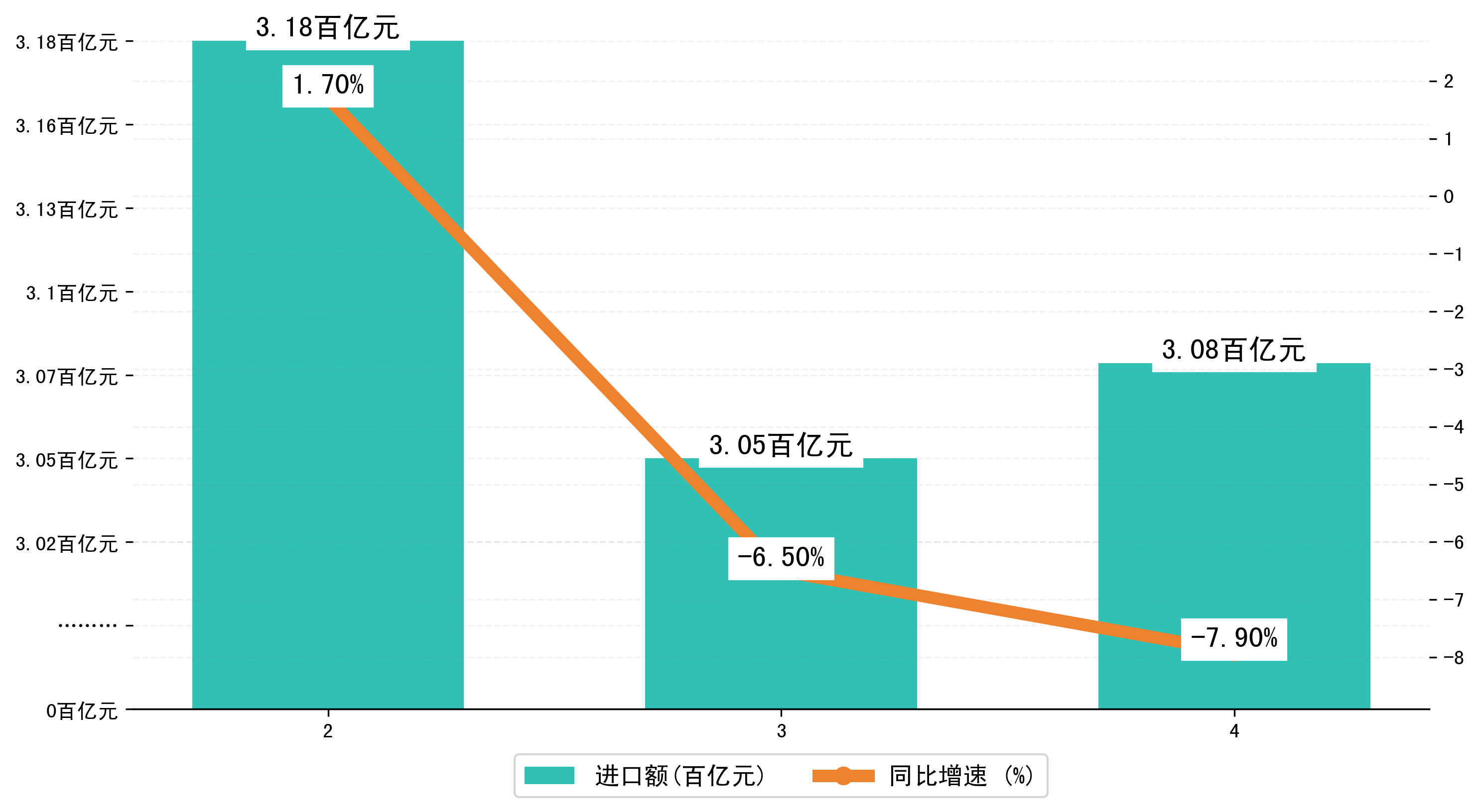 以人民币计,2025年4月天津市进口额为307,7626.566万元,相比上月增加了3,1644.0894万元;相比上年同期减少了43,0017.9825万元,同比减少了-7.90%。