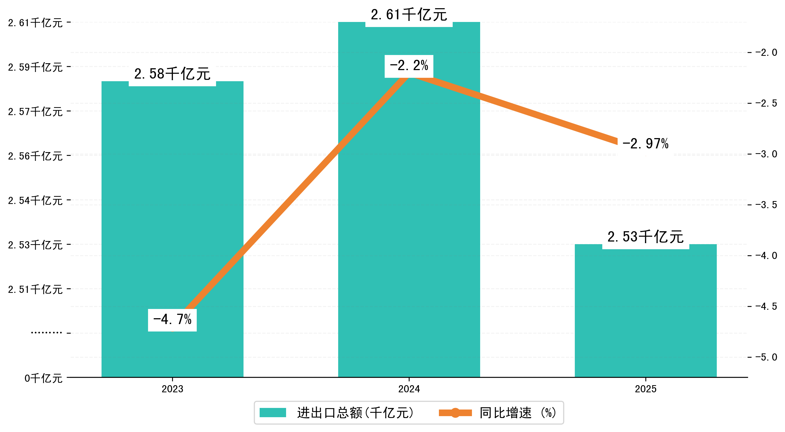 以人民币计,2025年1-4月天津市进出口总额为2528,2229.6942万元,相比上年同期减少了77,3606.2313万元,同比减少了-2.90%。