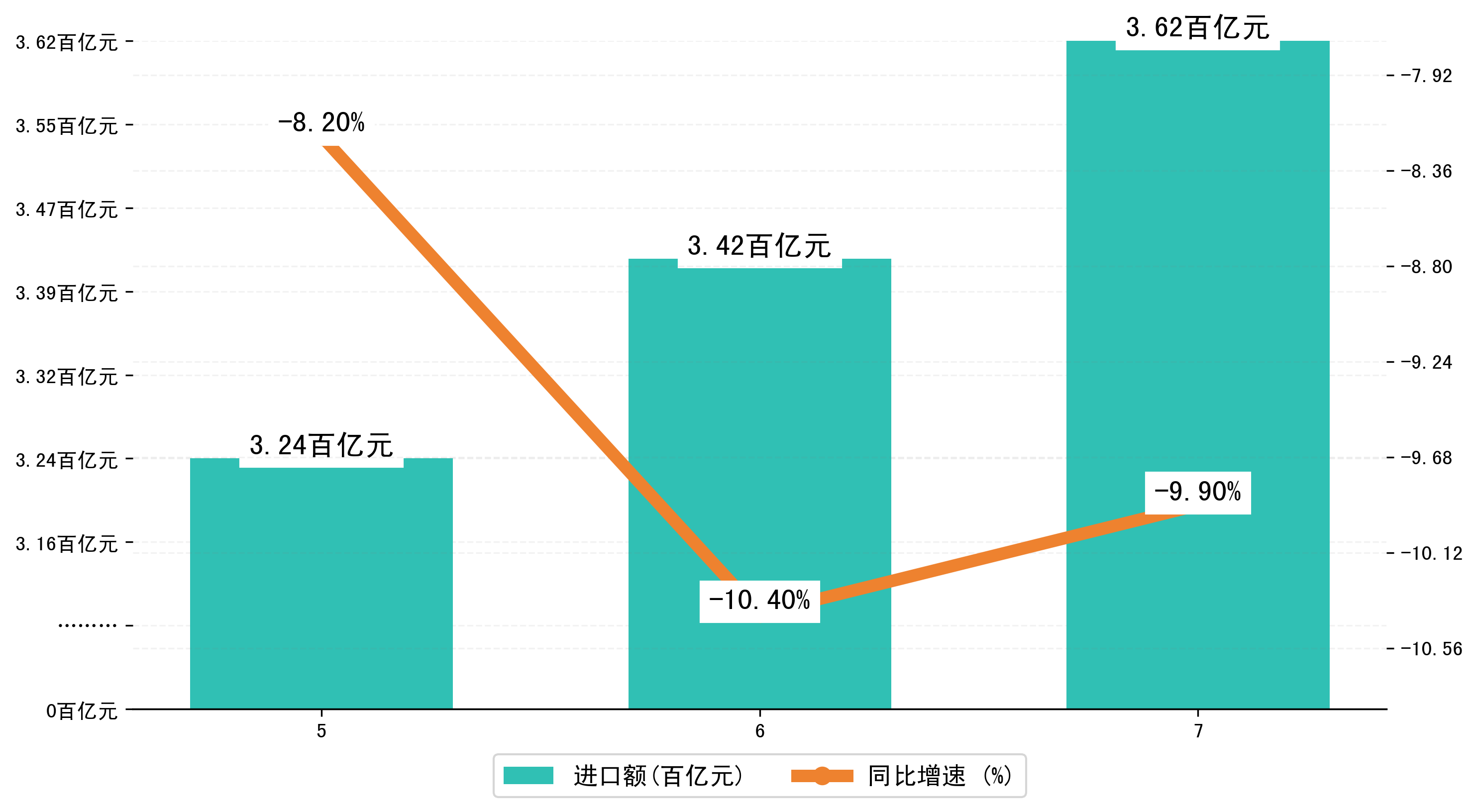 以人民币计,2025年7月天津市进口额为362,4474.6237万元,相比上月增加了20,1680.9852万元;相比上年同期减少了27,3683.7912万元,同比减少了-9.90%。