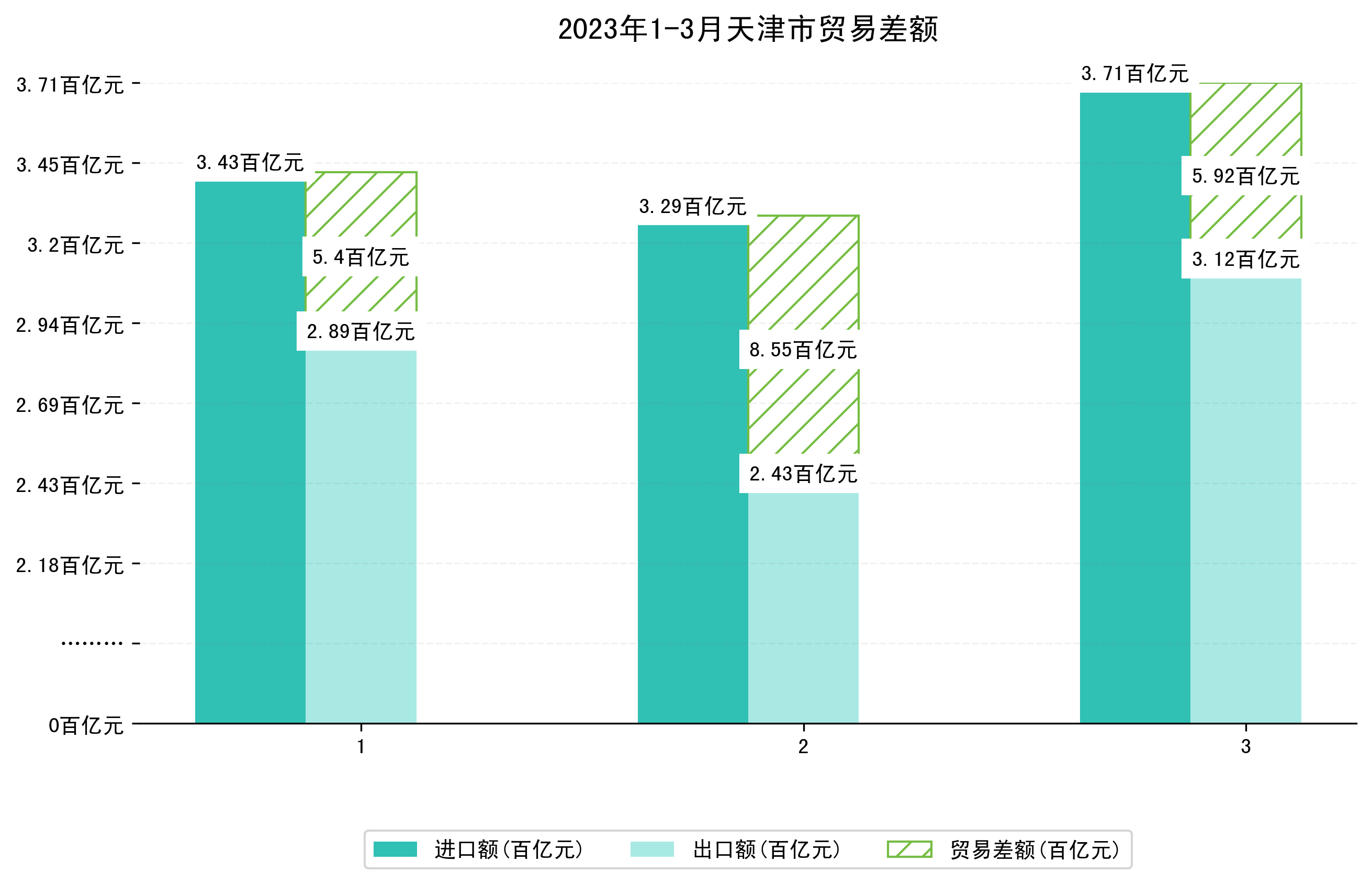 以人民币计,2023年1-3月天津市贸易差额为198,7354,0245万元(贸易逆差),相比上年同期减少了37,2638,9985万元,同比减少23.08%。