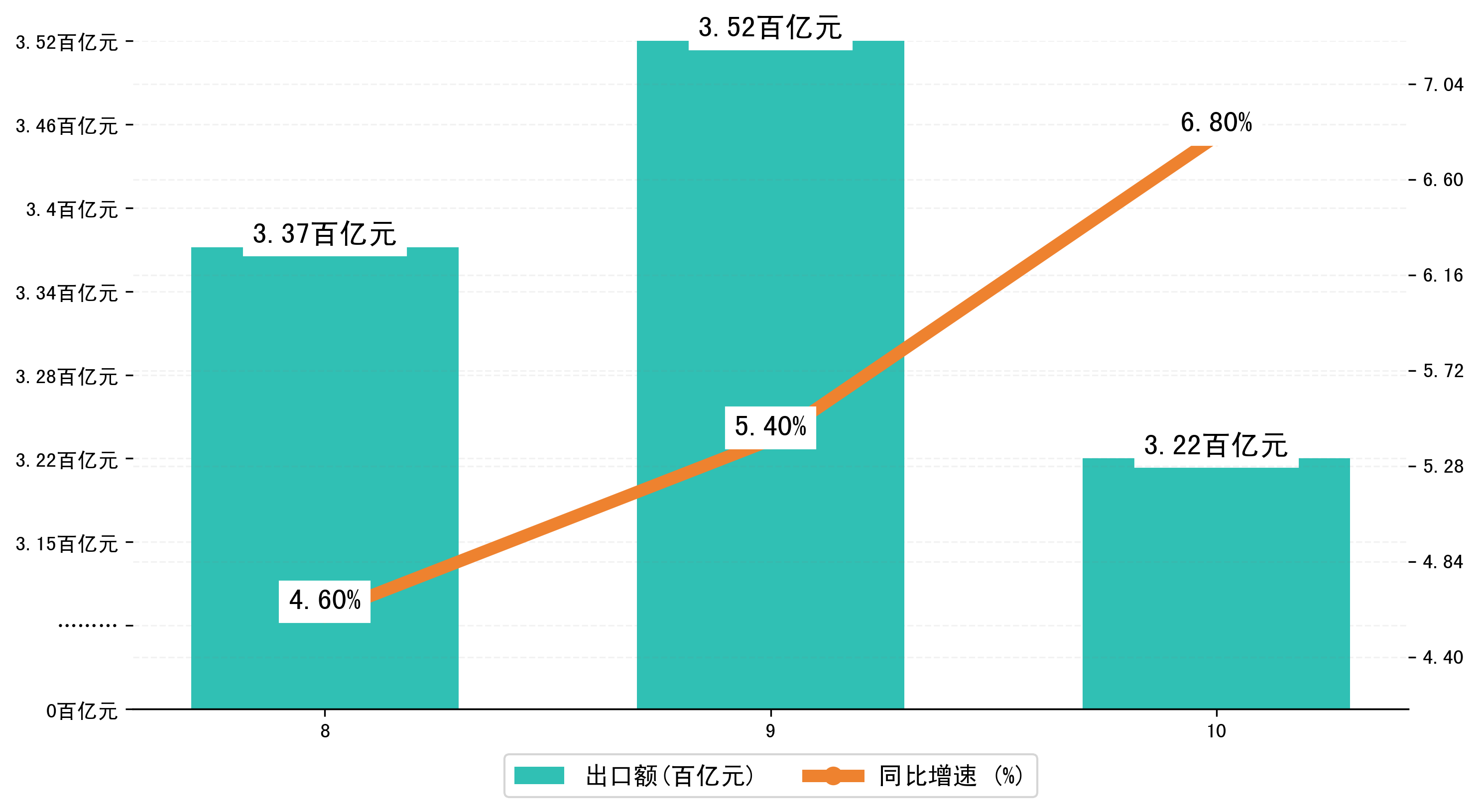 以人民币计,2024年1-10月天津市出口额为3227,0554.9583万元,相比上年同期增加了193,4925.8146万元,同比增加了6.80%。