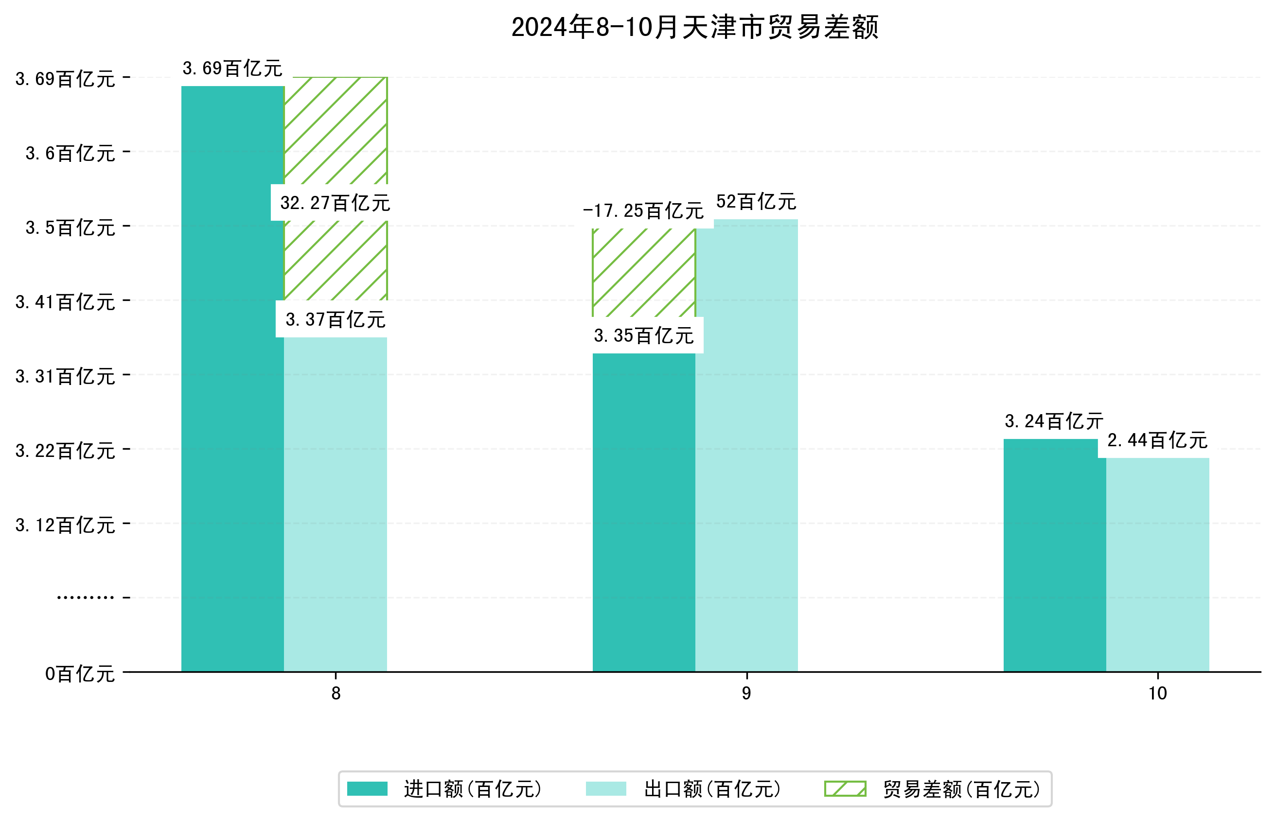 以人民币计,2024年10月天津市进口额为323,9953.0745万元,相比上月减少了10,9908.4986万元;相比上年同期减少了47,7145.4248万元,同比减少了-2.20%。