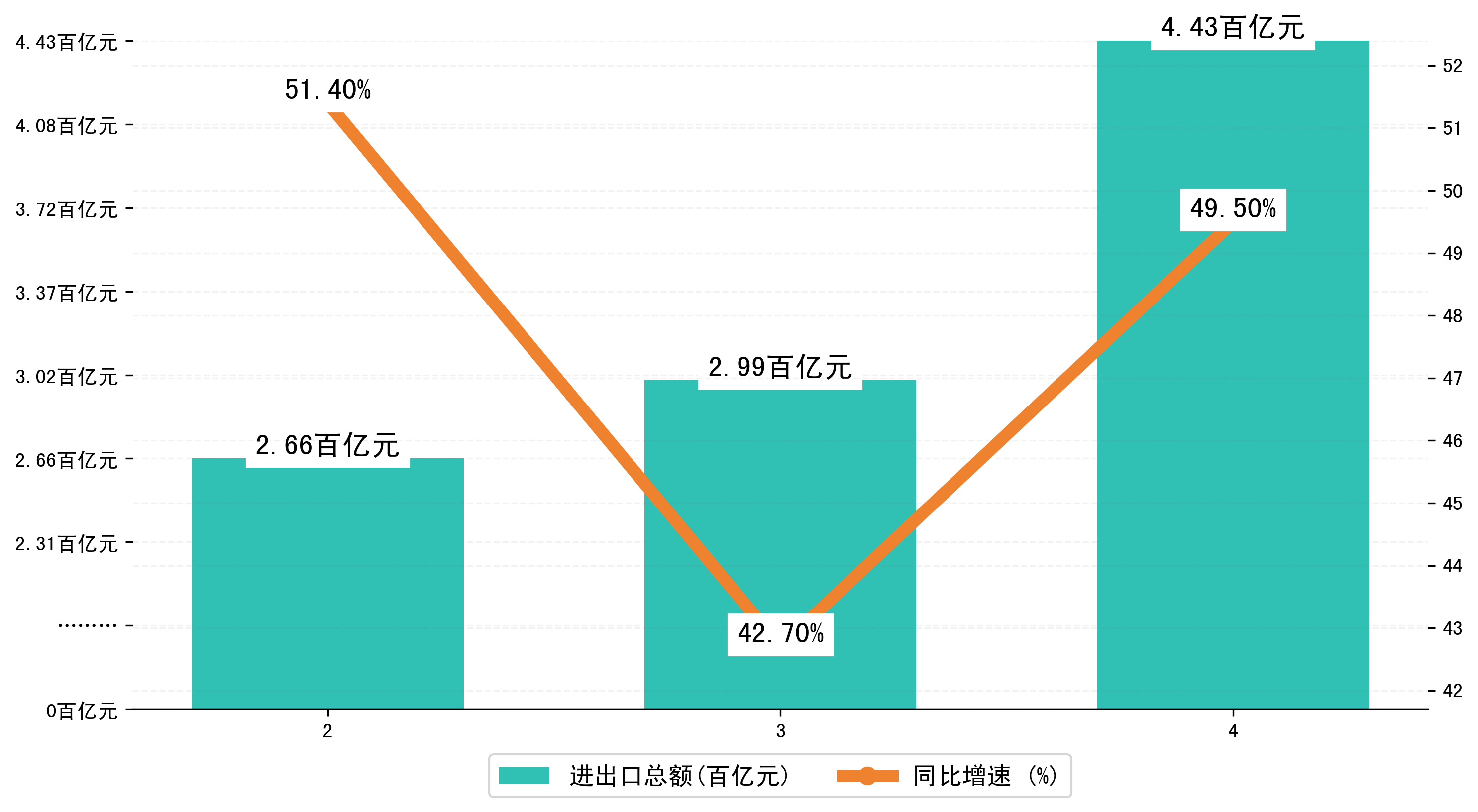 (图一:2024年2-4月新疆维吾尔自治区进出口总额)