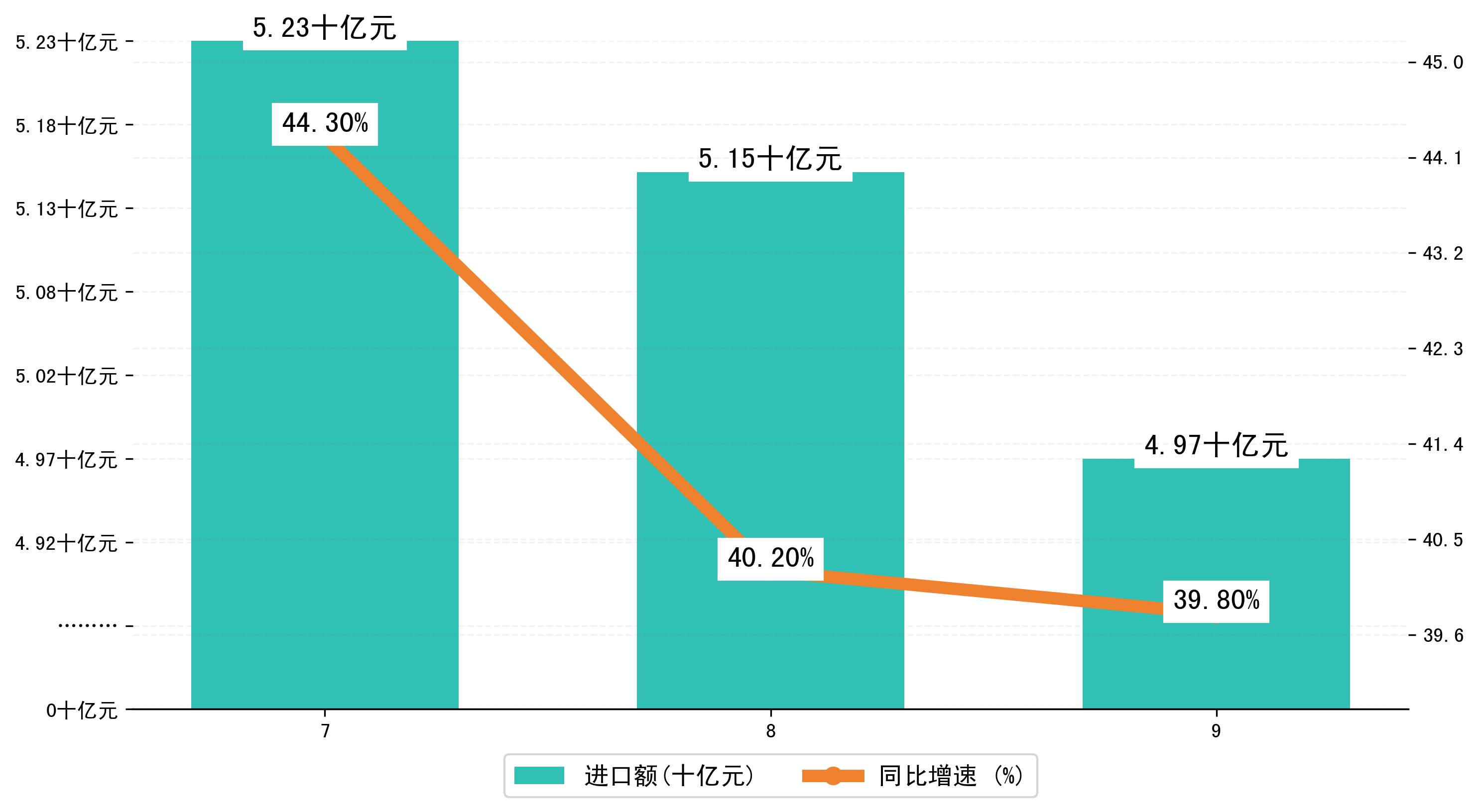 以人民币计,2023年1-9月新疆维吾尔自治区进口额为394,5856.084万元,相比上年同期增加了111,9935.0881万元,同比增加了39.80%。