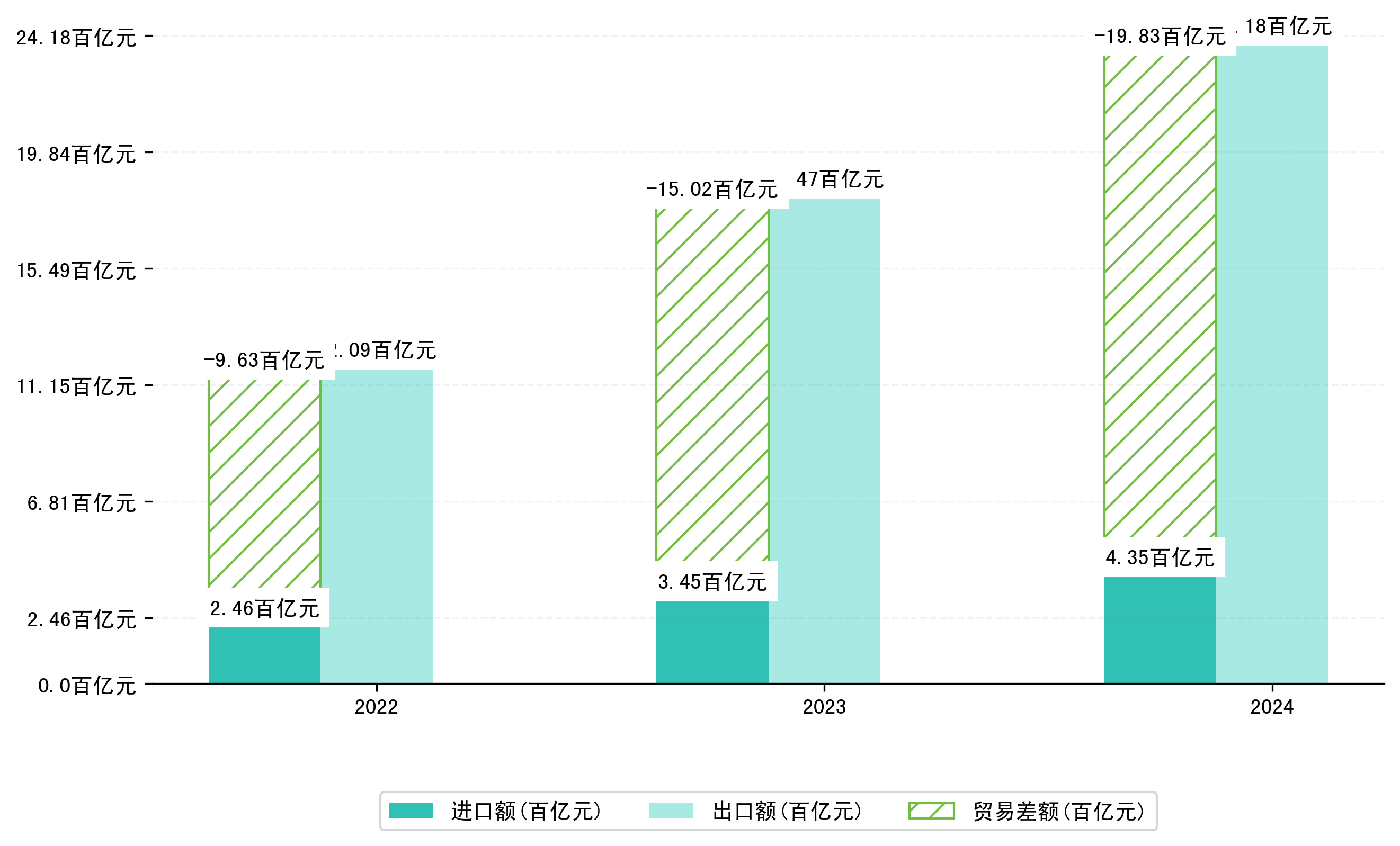以人民币计,2024年8月新疆维吾尔自治区贸易差额为208,3475,2946万元(贸易顺差),相比上月增加了3,4097,9153万元,即4188,0199万美元;相比上年同期减少了49,5027,6082万元,同比减少-19.2%。