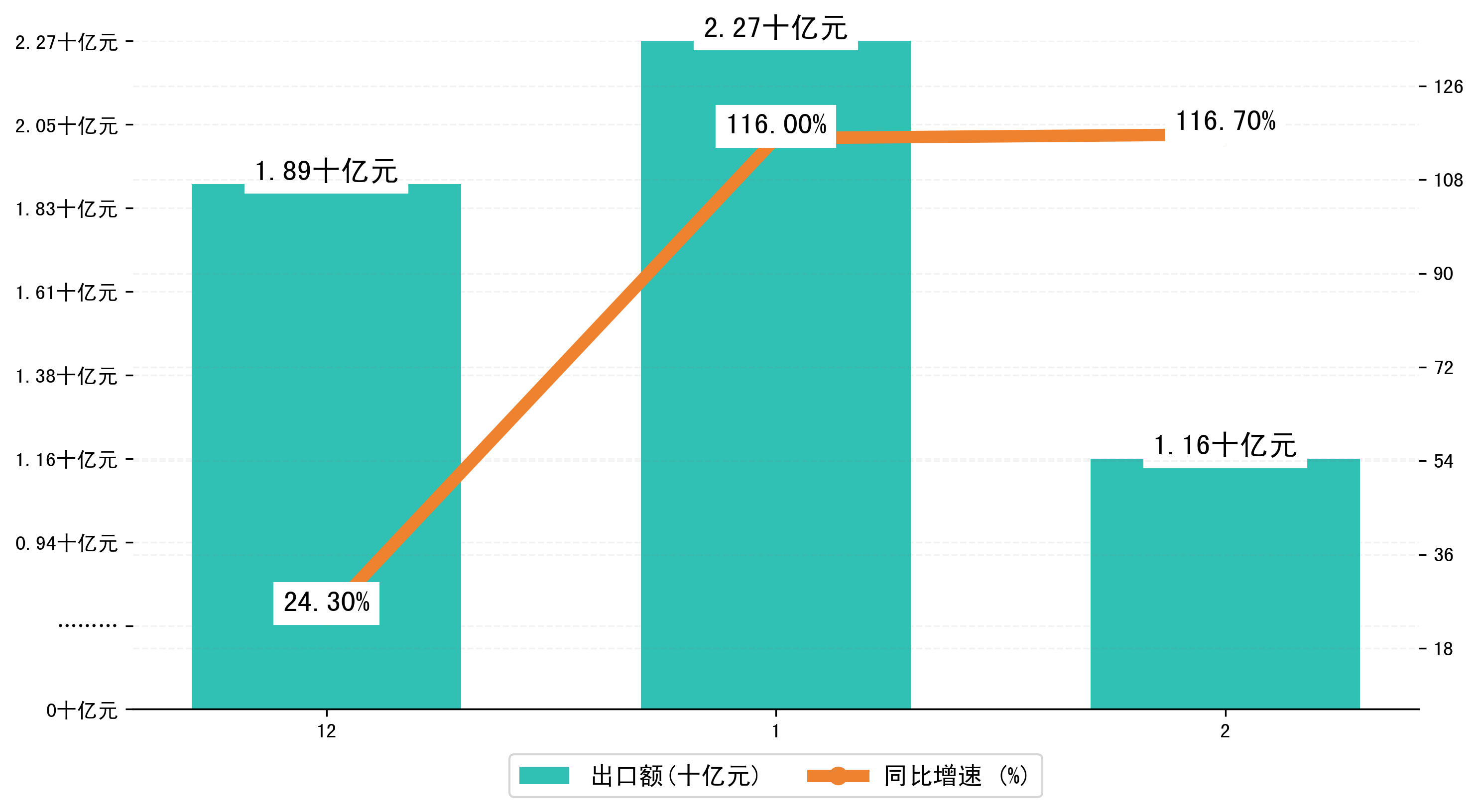 以美元计,2023年1-2月湘潭市出口额为4,9569.7193万美元,相比上年同期增加了2,4699.3139万美元,同比增加99.60%。