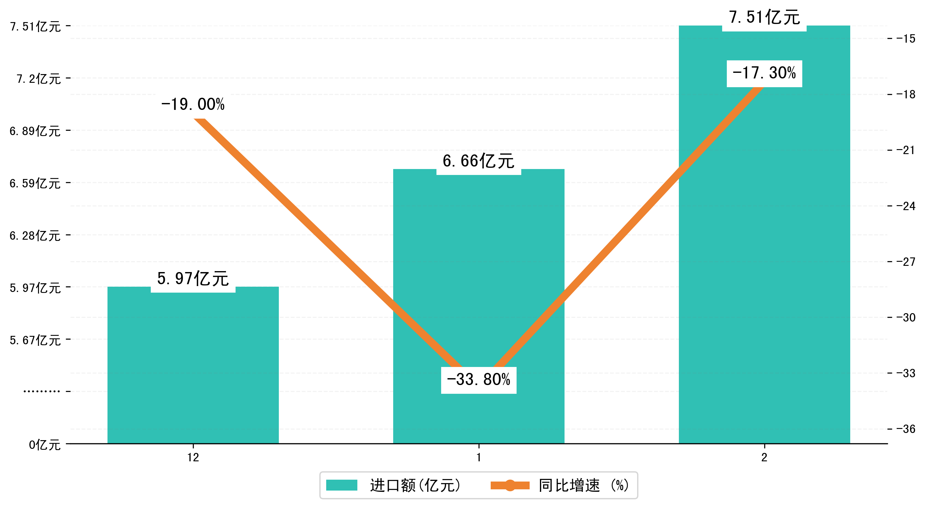以人民币计,2023年1-2月湘潭市进口额为14,1696.2766万元,相比上年同期减少了4874.4216万元,同比减少了-17.30%。