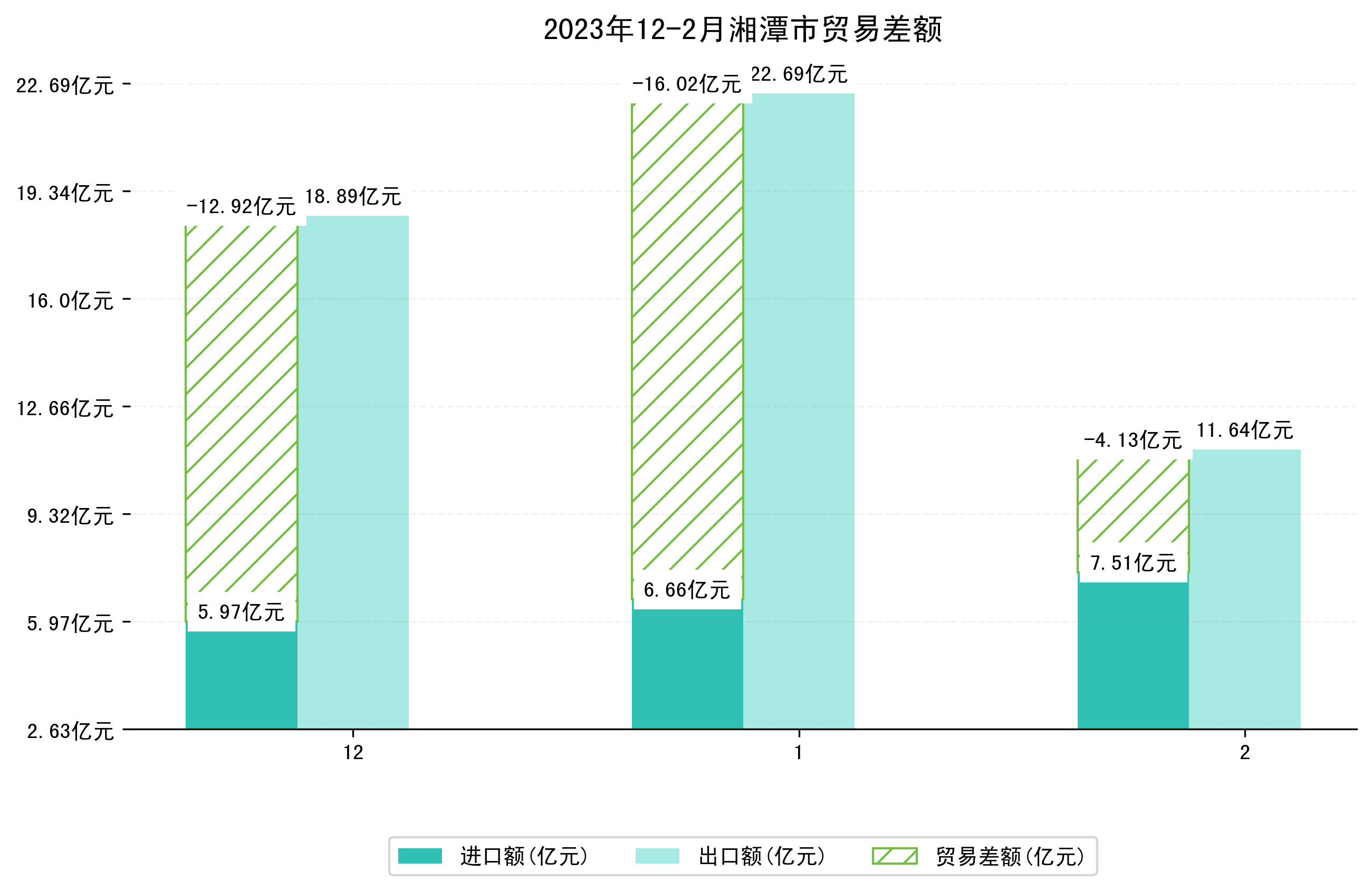 以人民币计,2023年1-2月湘潭市贸易差额为20,1536,7346万元(贸易顺差),相比上年同期增加了18,9491,6583万元,同比增加1573.19%。