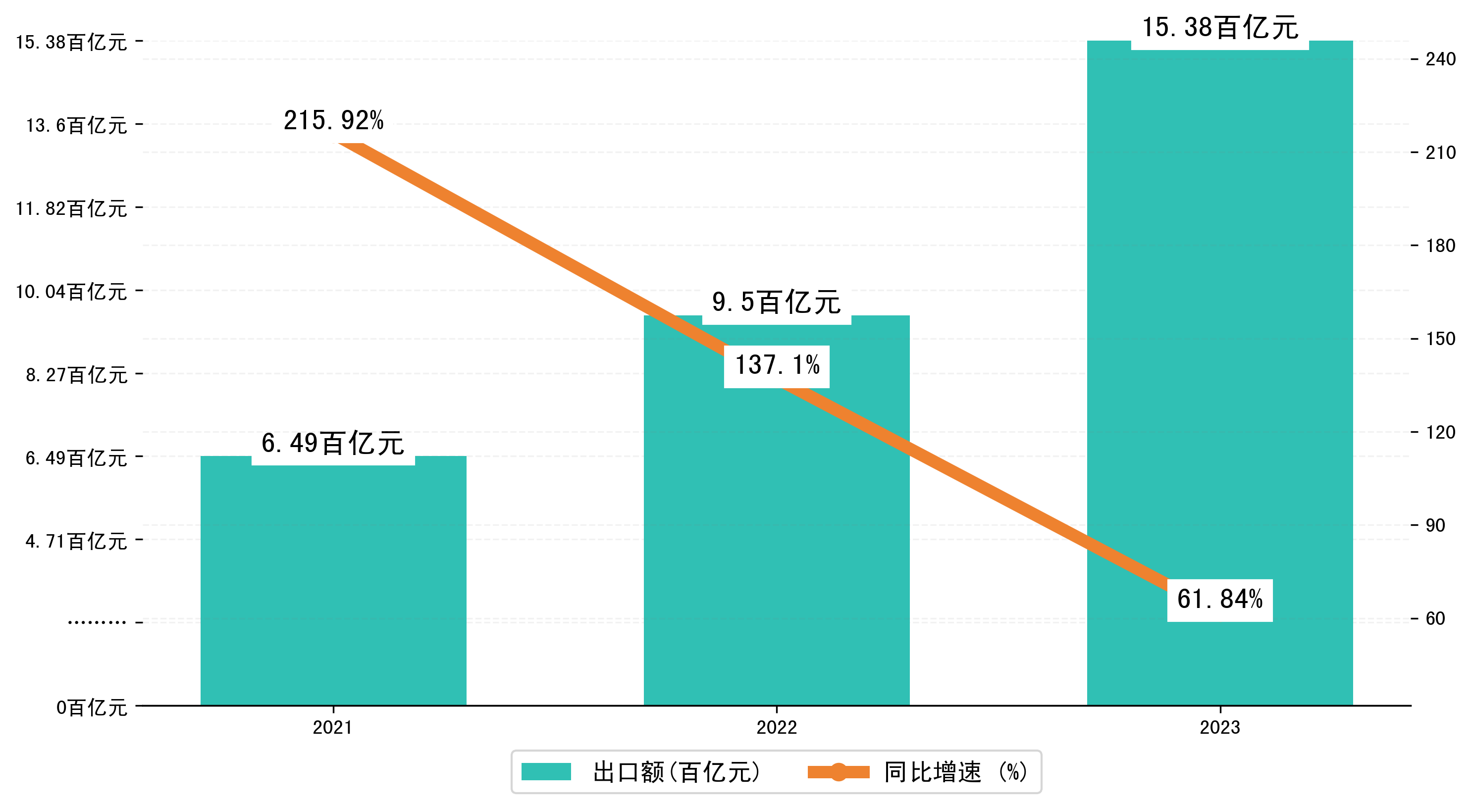 以美元计,2023年1-7月新疆维吾尔自治区出口额为221,7527.4219万美元,相比上年同期增加了75,7885.9891万美元,同比增加52.50%。