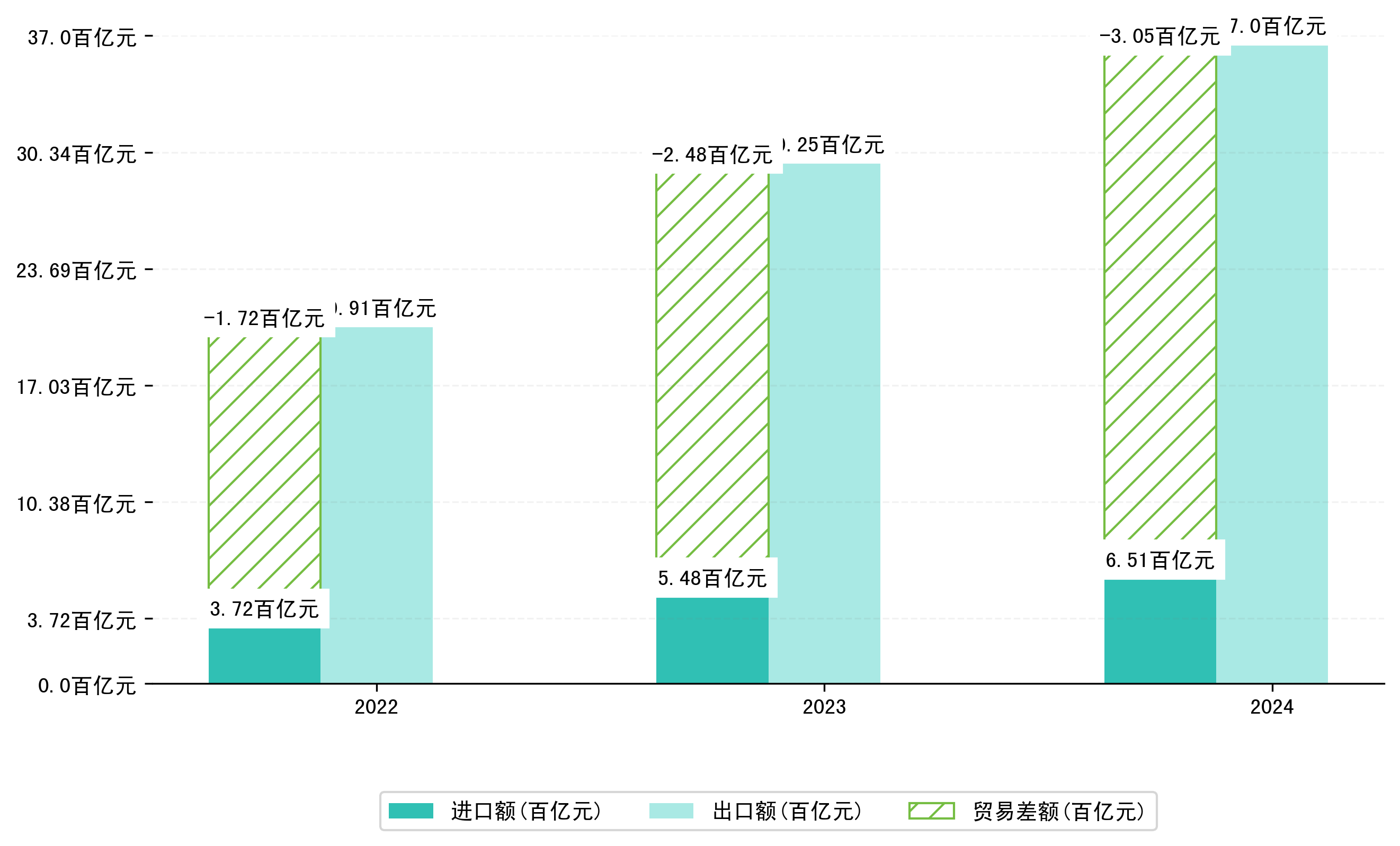 以美元计,2024年1-12月新疆维吾尔自治区进口额为91,5466.0167万美元,相比上年同期增加了13,7025.9607万美元,同比增加17.50%。