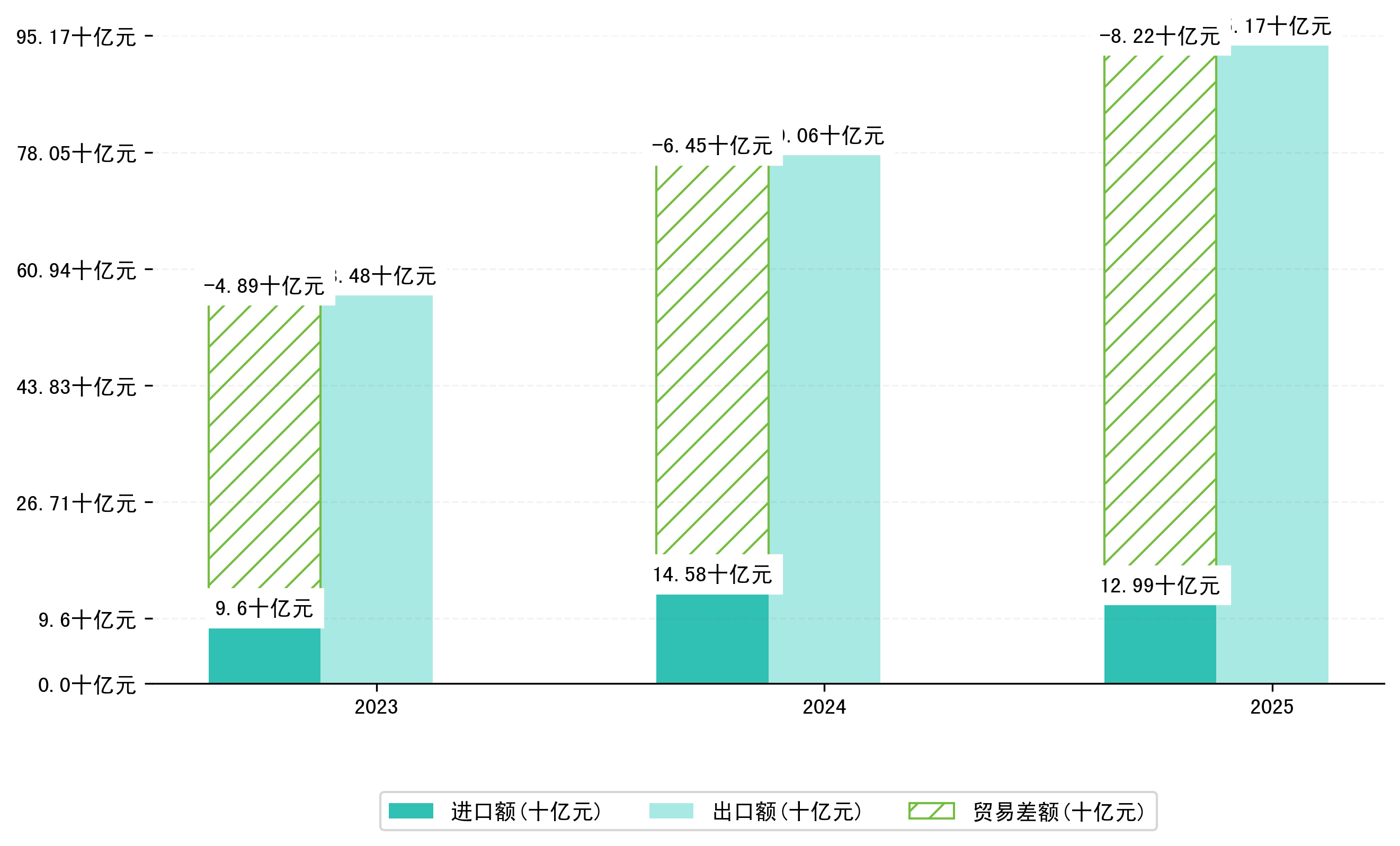 以人民币计,2025年1-3月新疆维吾尔自治区贸易差额为821,7665,1775万元(贸易顺差),相比上年同期增加了176,9846,6702万元,同比增加27.45%。