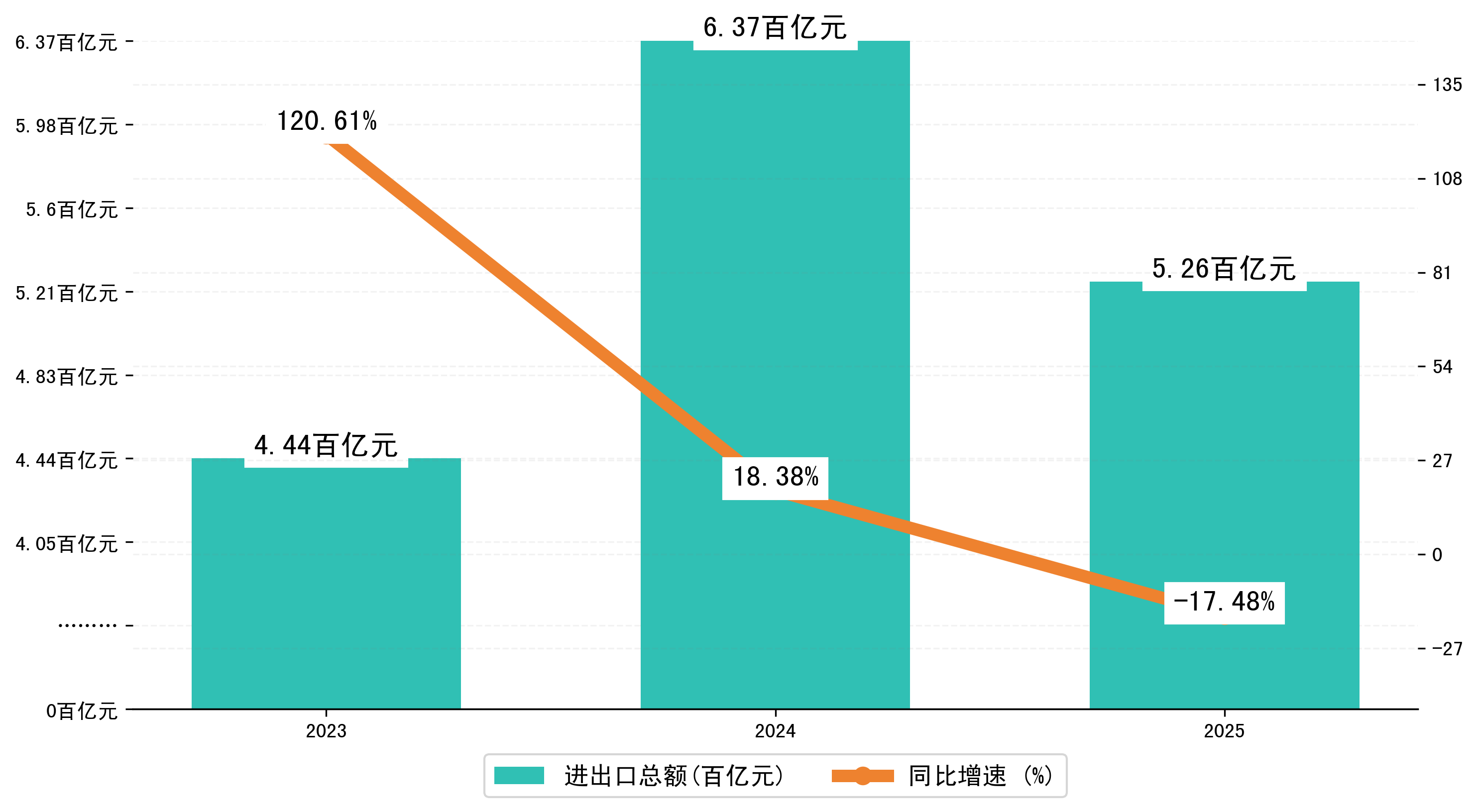 以人民币计,2025年1-2月新疆维吾尔自治区进出口总额为525,5386.5855万元,相比上年同期减少了111,3523.1097万元,同比减少了-17.50%。