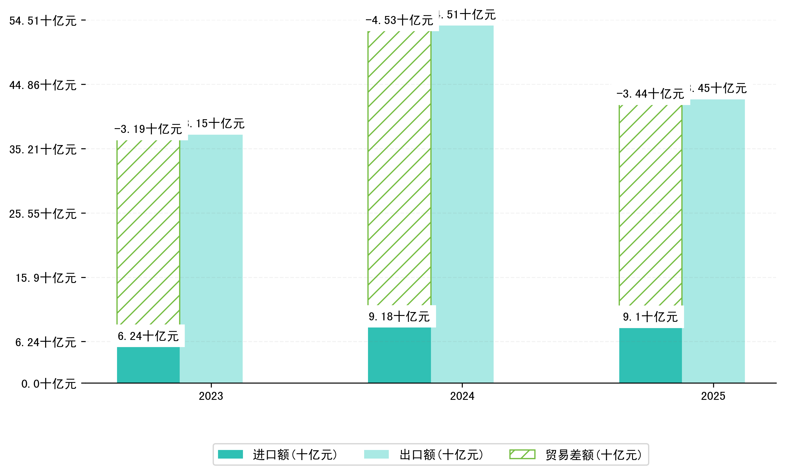 以人民币计,2025年1-2月新疆维吾尔自治区贸易差额为343,5207,2699万元(贸易顺差),相比上年同期减少了109,8517,9651万元,同比减少-24.23%。